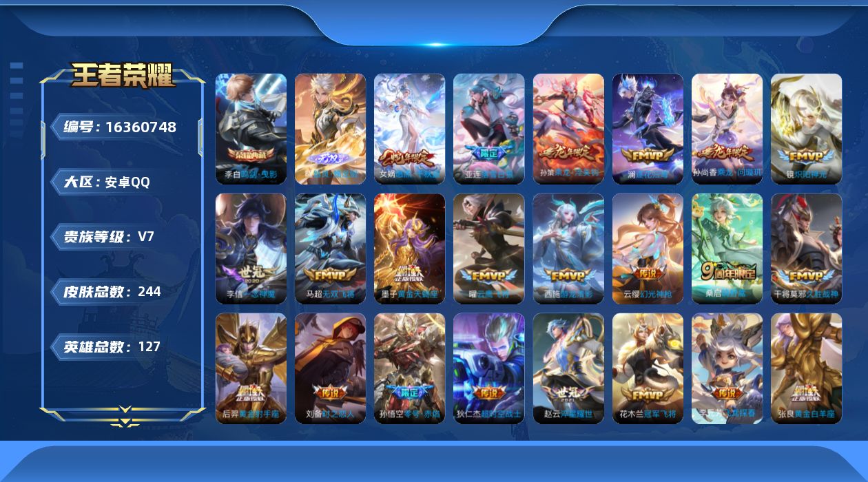 [16360748]可二次【特价急出/详情看图】安卓Q-V7-最强王者段位-127英雄-244皮肤-1典藏皮肤-1无双-1星元-24传说-71史诗