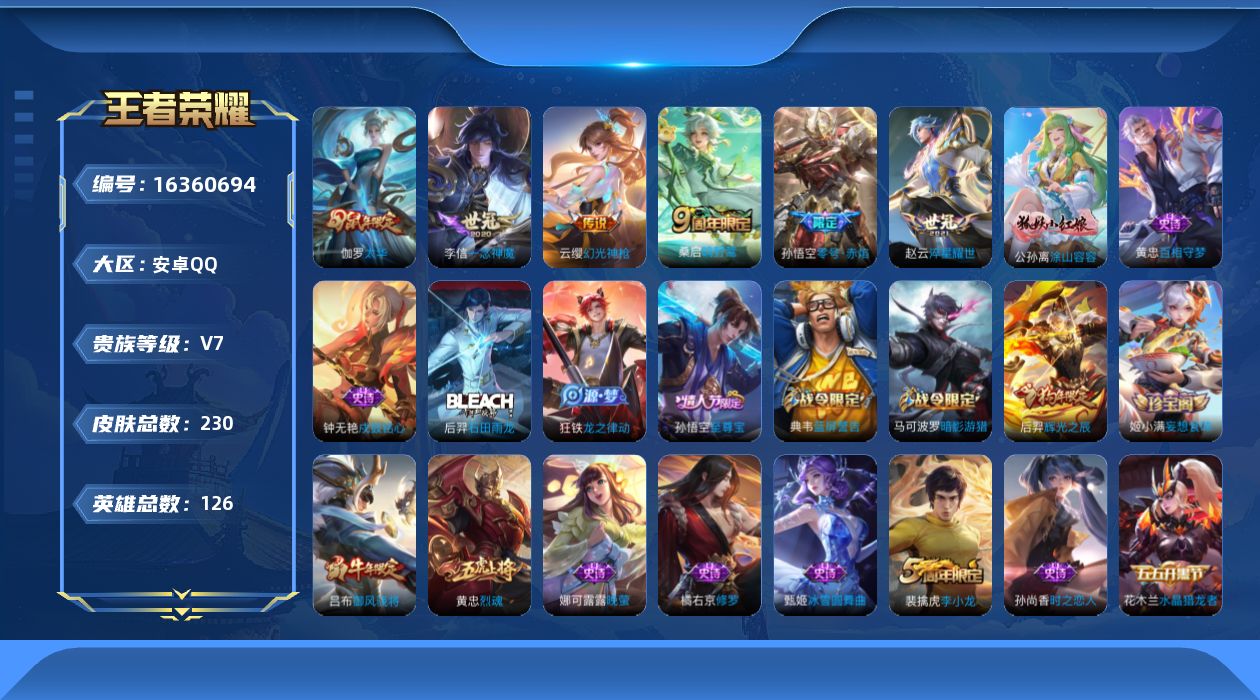 [16360694]【特价急出/详情看图】安卓Q-V7-永恒钻石I段位-126英雄-230皮肤-7传说-57史诗