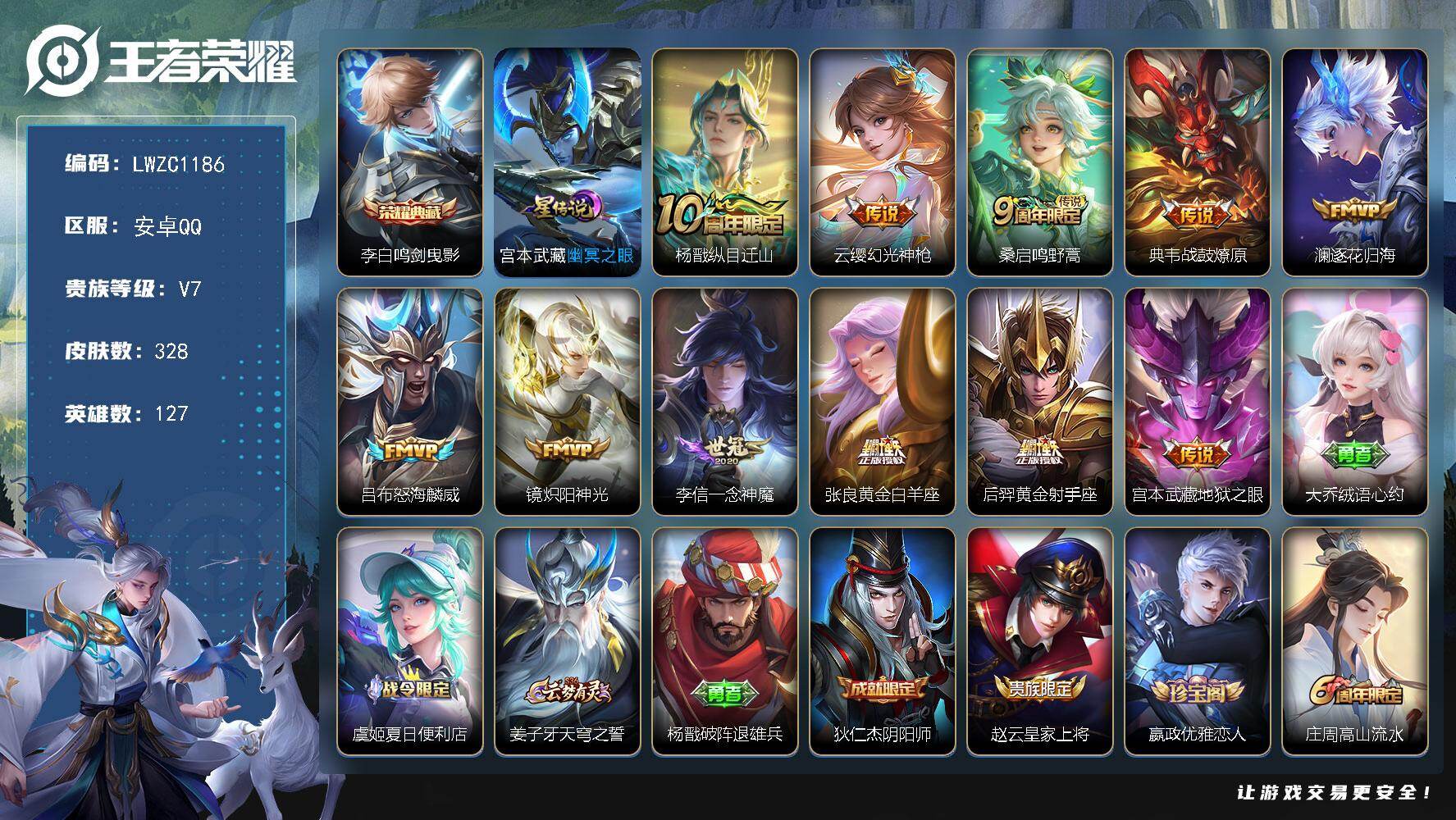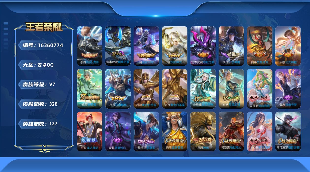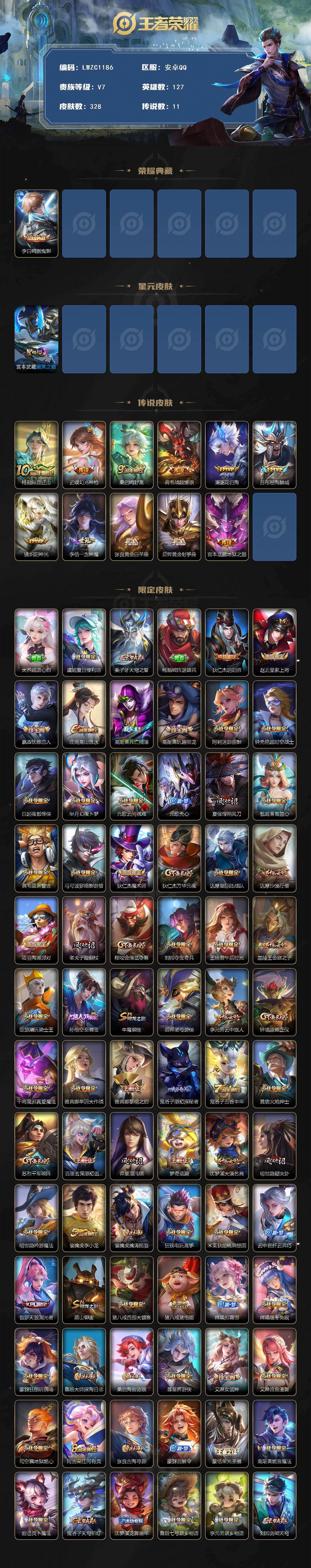 [16360774]【特价急出/详情看图】安卓Q-V7-最强王者段位-127英雄-328皮肤-1典藏皮肤-1星元-11传说-83史诗