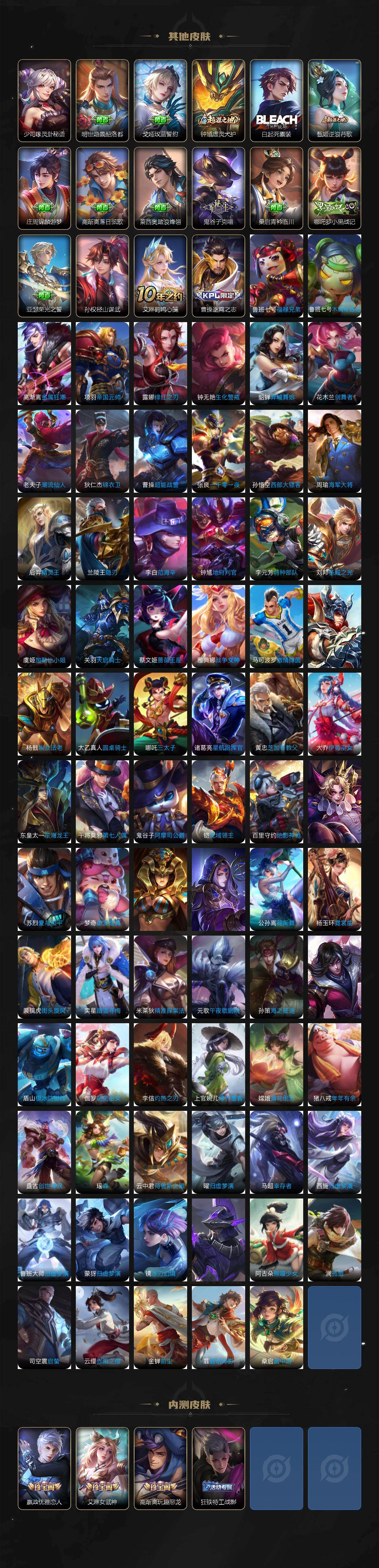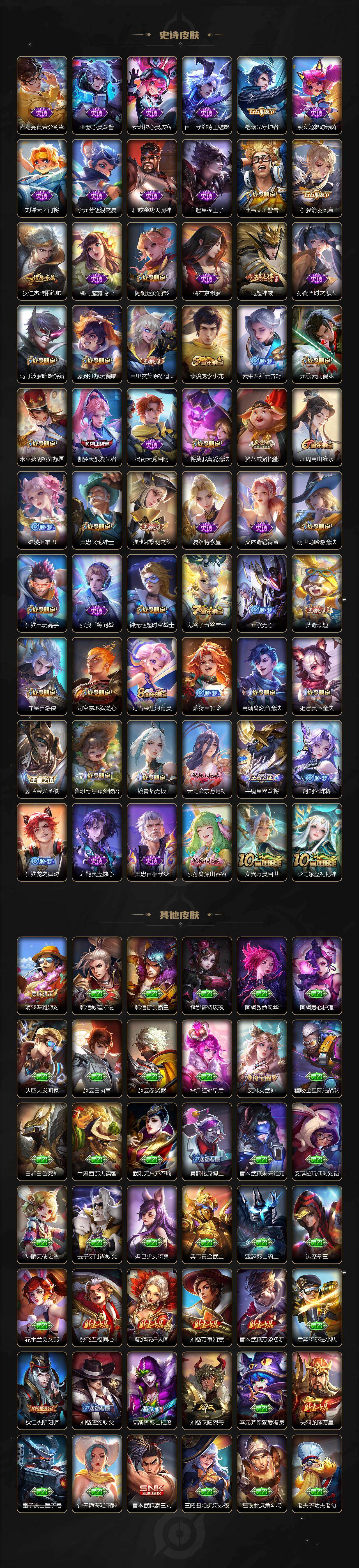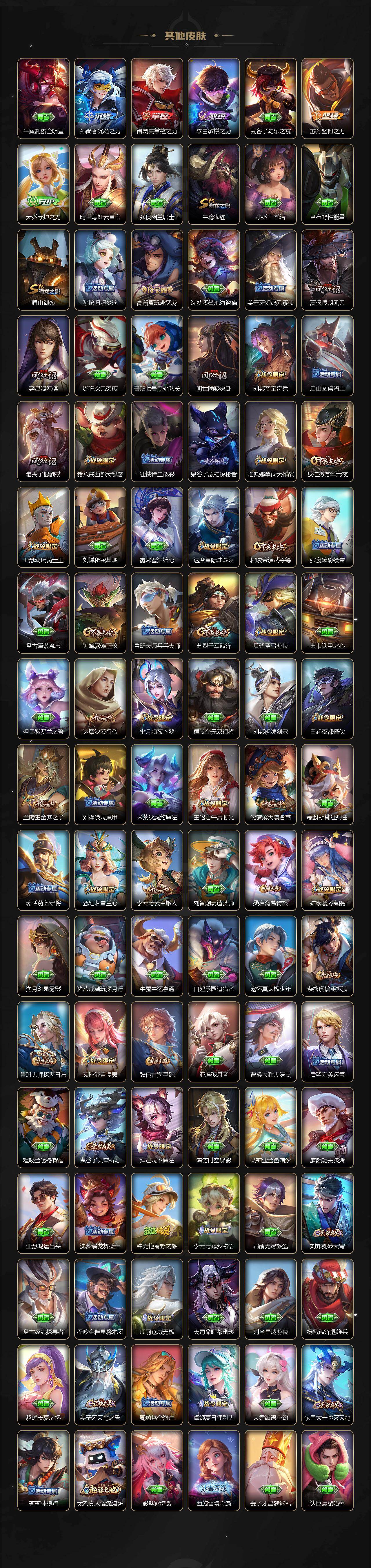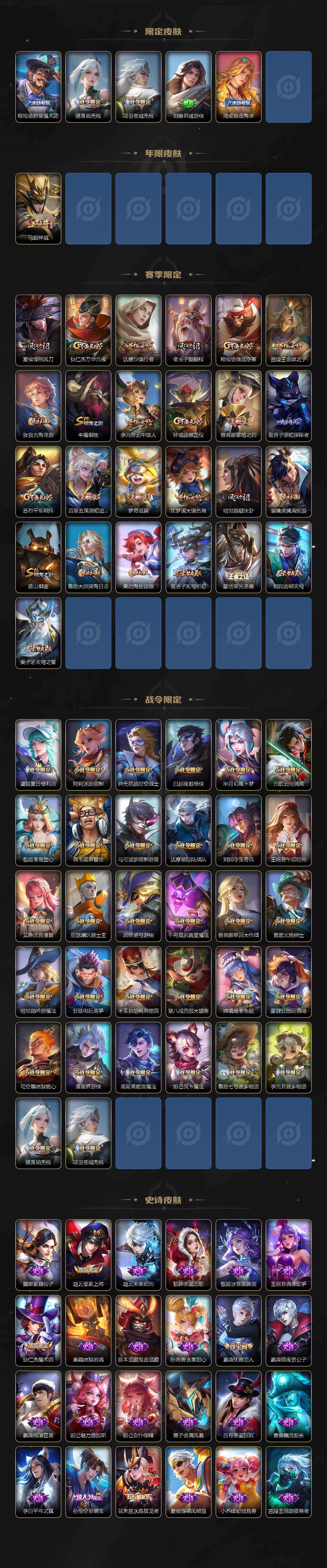 【限定皮肤】:大乔绒语心约,虞姬夏日便利店,姜子牙天穹之誓,杨戬破阵退雄兵,狄仁杰阴阳师,赵云皇家上将,嬴政优雅恋人,庄周高山流水,高渐离死亡摇滚,高渐离玩趣恶龙,阿轲迷踪丽影,钟无艳超时空战士,白起夜都怪侠,芈月幻夜卜梦,元歌云间偶戏,元歌无心,夏侯惇朔风刀,甄姬落雪兰心,典韦蓝屏警告,马可波罗暗影游猎,狄仁杰魔术师,狄仁杰万华元夜,达摩星际陆战队,达摩沙漠行僧,项羽海滩派对,老夫子醍醐杖,程咬金演武夺筹,刘邦夺宝奇兵,王昭君午后时光,兰陵王金庭之子,亚瑟潮玩骑士王,孙悟空至尊宝,牛魔御旌,后羿圣弓游侠,李元芳云中旅人,钟馗驱傩正仪,干将莫邪真爱魔法,雅典娜单词大作战,雅典娜黎明之约,鬼谷子原初探秘者,鬼谷子五谷丰年,黄忠火炮绅士,苏烈千军破阵,百里玄策原初追逐者,弈星混沌棋,梦奇顽趣,沈梦溪大漠名商,明世隐疑决卦,明世隐吟游魔法,裴擒虎李小龙,裴擒虎擒涛扼浪,狂铁电玩高手,米莱狄胡桃异想国,云中君纤云弄巧,伽罗天狼溯光者,盾山御銮,猪八戒西部大镖客,猪八戒猪悟能,嫦娥拒霜思,嫦娥暖冬兔眠,蒙犽狂想玩偶喵,鲁班大师探海日志,桑启海盐诗旅,暃星界游侠,艾琳女武神,艾琳流音漫舞,司空震地狱燃心,阿古朵江河有灵,张良古海寻踪,蒙犽百解令,蒙恬荣光圣徽,高渐离燃音魔法,妲己灵卜魔法,鬼谷子天穹祈灯,沈梦溪龙舞盛年,鲁班七号蔬乡物语,李元芳蔬乡物语,刘邦剑破天穹,程咬金群星魔术团,镜青焰无极,项羽苍威无极,刘备异域游侠,周瑜熔金海岸