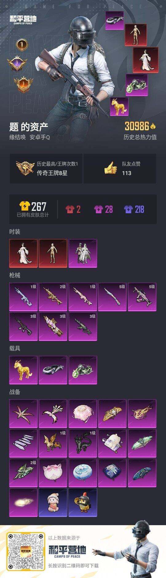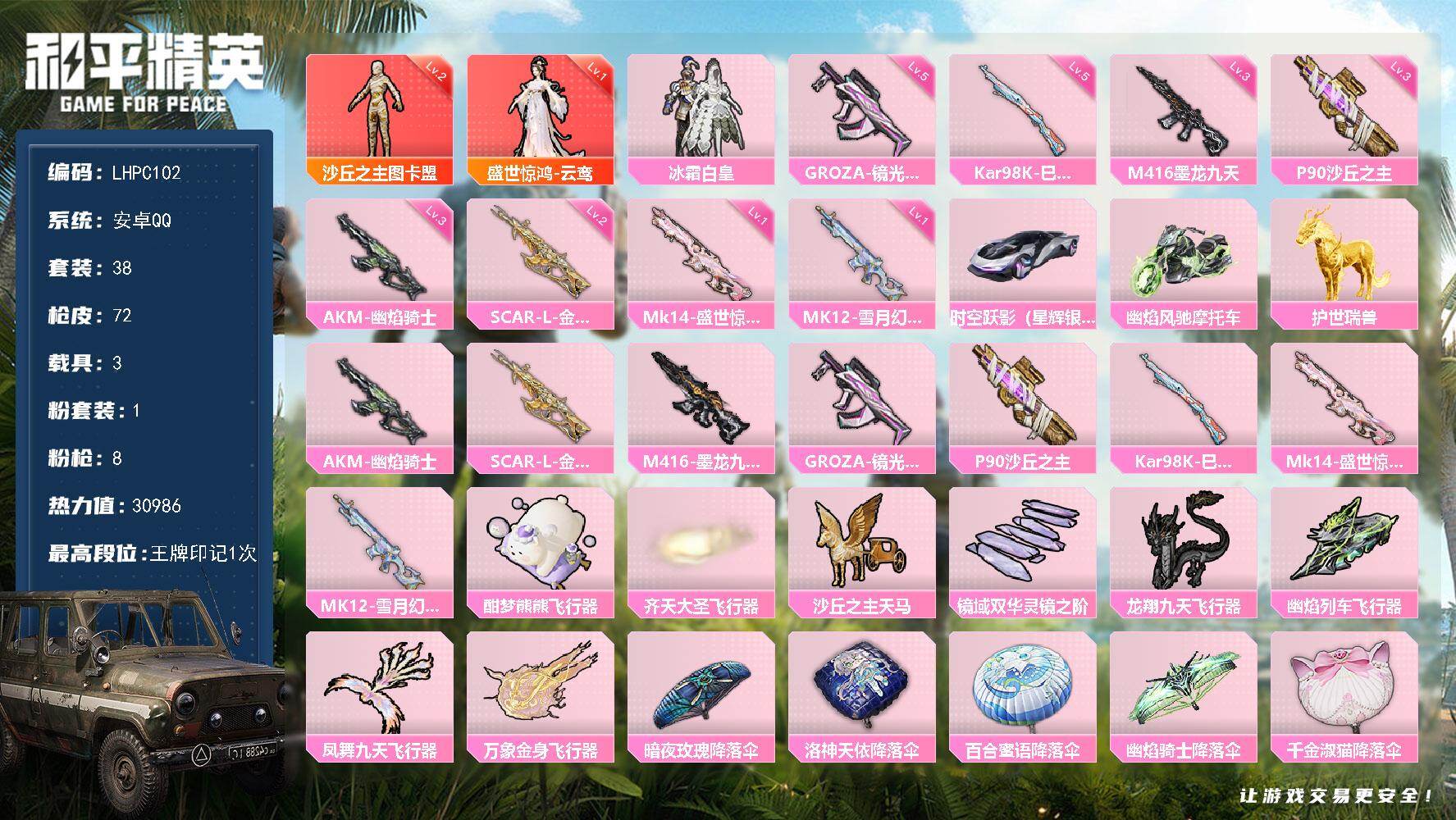 [16360837]安卓 手Q-2神装-1粉装-8特效枪-3载具-9粉色飞行器-30986热力值-1王牌印记-38套装-72枪皮