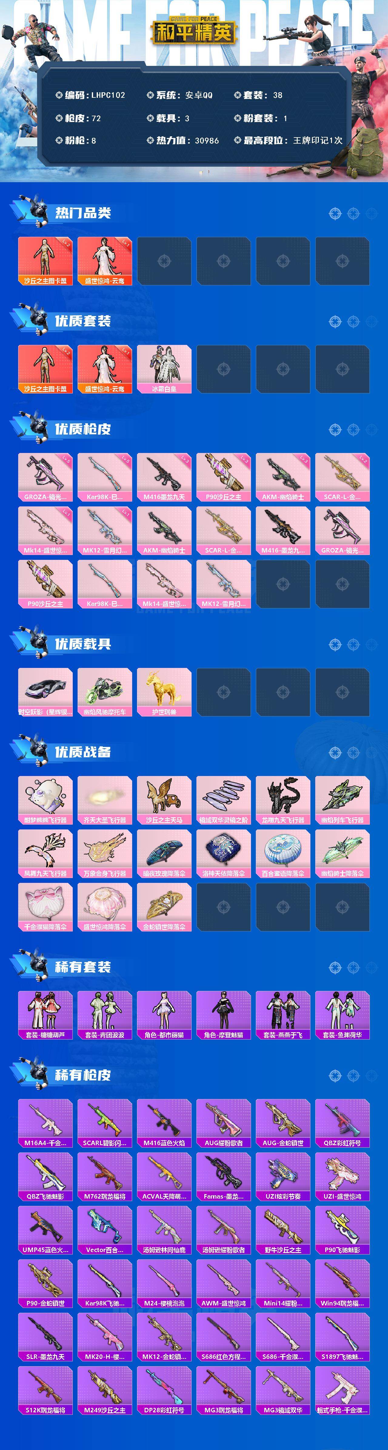 [16360837]安卓 手Q-2神装-1粉装-8特效枪-3载具-9粉色飞行器-30986热力值-1王牌印记-38套装-72枪皮 【红色神装等级】:盛世惊鸿-云鸾(一级),沙丘之主-图卡盟(二级) 【红色角色神装】:盛世惊鸿-云鸾,沙丘之主-图卡盟 【粉色套装】:粉装-冰霜白皇 【粉色枪皮等级】:AKM-幽焰骑士(三级),SCAR-L-金蛇镇世(二级),M416-墨龙九天(三级),GROZA-镜光银凌(五级),P90-沙丘之主(三级),Kar98K-巳巳如意(五级),Mk14-盛世惊鸿(一级),MK12-雪月幻音(一级) 【粉色载具】:时空跃影(星辉银),幽焰风驰摩托车,护世瑞兽 【粉色枪皮】:AKM-幽焰骑士,SCAR-L-金蛇镇世,M416-墨龙九天,GROZA-镜光银凌,P90-沙丘之主,Kar98K-巳巳如意,Mk14-盛世惊鸿,MK12-雪月幻音 【粉色飞行器】:酣梦熊熊飞行器,齐天大圣飞行器,沙丘之主天马,镜域双华-灵镜之阶,龙翔九天飞行器,幽焰列车飞行器,凤舞九天飞行器,万象金身飞行器 【粉色降落伞】:暗夜玫瑰降落伞,洛神天依降落伞,百合蜜语降落伞,幽焰骑士降落伞,千金淑猫降落伞,盛世惊鸿降落伞,金蛇镇世降落伞 【稀有套装】:套装-糖糖葫芦,套装-青团波波,角色-都市丽猫,角色-摩登魅猫,套装-燕燕于飞,套装-鱼渊荷华 【稀有枪皮】:M16A4-千金淑猫,SCAR-L-碧影闪光,M416-蓝色火焰,AUG-耀粉歌者,AUG-金蛇镇世,QBZ-彩虹符号,QBZ-飞驰魅影,M762-瑞龙福将,AC-VAL-天降萌叽,Famas-墨龙九天,UZI-炫彩节奏,UZI-盛世惊鸿,UMP45-蓝色火焰,Vector-百合蜜语,汤姆逊-林间仙鹿,汤姆逊-耀粉歌者,野牛-沙丘之主,P90-飞驰魅影,P90-金蛇镇世,Kar98K-飞驰魅影,M24-樱桃泡泡,AWM-盛世惊鸿,Mini14-耀粉歌者,Win94-瑞龙福将,SLR-墨龙九天,MK20-H-樱桃泡泡,MK12-金蛇镇世,S686-红色方程式,S686-千金淑猫,S1897-飞驰魅影,S12K-瑞龙福将,M249-沙丘之主,DP-28-彩虹符号,MG3-镜域双华,MG3-瑞龙福将,蝎式手枪-千金淑猫,大砍刀-盛世惊鸿,破片手榴弹-巳巳如意 【其他套装】:套装-SS17特训,套装-夏日音浪,套装-格斗先锋,套装-滨海假日,套装-