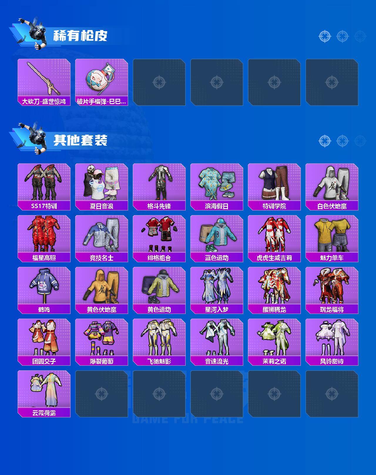 【稀有枪皮】:M16A4-千金淑猫,SCAR-L-碧影闪光,M416-蓝色火焰,AUG-耀粉歌者,AUG-金蛇镇世,QBZ-彩虹符号,QBZ-飞驰魅影,M762-瑞龙福将,AC-VAL-天降萌叽,Famas-墨龙九天,UZI-炫彩节奏,UZI-盛世惊鸿,UMP45-蓝色火焰,Vector-百合蜜语,汤姆逊-林间仙鹿,汤姆逊-耀粉歌者,野牛-沙丘之主,P90-飞驰魅影,P90-金蛇镇世,Kar98K-飞驰魅影,M24-樱桃泡泡,AWM-盛世惊鸿,Mini14-耀粉歌者,Win94-瑞龙福将,SLR-墨龙九天,MK20-H-樱桃泡泡,MK12-金蛇镇世,S686-红色方程式,S686-千金淑猫,S1897-飞驰魅影,S12K-瑞龙福将,M249-沙丘之主,DP-28-彩虹符号,MG3-镜域双华,MG3-瑞龙福将,蝎式手枪-千金淑猫,大砍刀-盛世惊鸿,破片手榴弹-巳巳如意