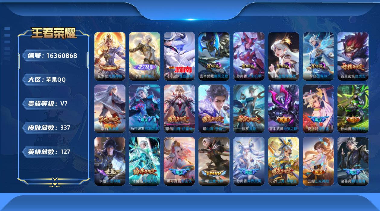 [16360868]可二次【特价出售/店主推荐 中路23段 2市标】苹果Q-V7-最强王者段位-127英雄-337皮肤-1典藏皮肤-1无双-1珍品传说-31传说-104史诗