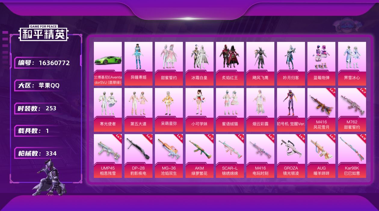 [16360772]苹果 手Q-16粉装-12特效枪-1载具-4粉色飞行器-114758热力值-21王牌印记-253套装-334枪皮