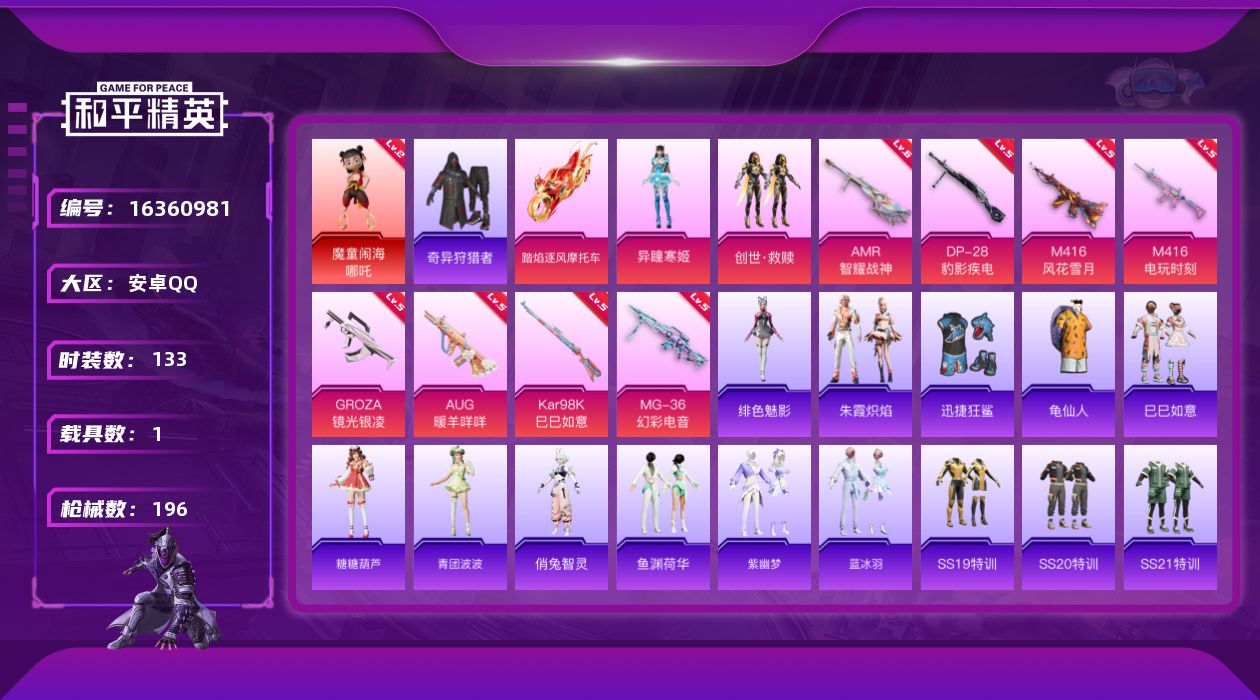 [16360981]【特价出售/店主推荐】安卓 手Q-1神装-2粉装-8特效枪-1载具-2粉色飞行器-53876热力值-6王牌印记-133套装-196枪皮 【红色神装等级】:魔童闹海-哪吒(二级) 【红色角色神装】:魔童闹海-哪吒 【热门品类】:套装-奇异狩猎者,套装-龟仙人 【粉色套装】:套装-创世·救赎,角色-异瞳寒姬 【粉色枪皮等级】:M416-风花雪月(五级),M416-电玩时刻(五级),GROZA-镜光银凌(五级),AUG-暖羊咩咩(五级),Kar98K-巳巳如意(五级),AMR-智耀战神(六级),DP-28-豹影疾电(五级),MG-36-幻彩电音(五级) 【粉色载具】:踏焰逐风摩托车 【粉色枪皮】:M416-风花雪月,M416-电玩时刻,GROZA-镜光银凌,AUG-暖羊咩咩,Kar98K-巳巳如意,AMR-智耀战神,DP-28-豹影疾电,MG-36-幻彩电音 【粉色飞行器】:飞天猪飞行器 【粉色降落伞】:至尊龙雀降落伞,环太平洋降落伞,江南烟雨降落伞,创世·救赎降落伞,忍者神龟降落伞,临安公主降落伞,星穹咏叹调降落伞,魔童闹海 哪吒降落伞,异瞳寒姬降落伞,炫彩糖果降落伞 【稀有套装】:套装-龟仙人,套装-巳巳如意,套装-糖糖葫芦,套装-青团波波,角色-俏兔智灵,套装-鱼渊荷华,套装-紫幽梦,套装-蓝冰羽,套装-朱霞炽焰,角色-绯色魅影,套装-炫彩糖果 【稀有枪皮】:AUG-冰晶雪宝,AKM-彩虹符号,AKM-破晓战魂,AKM-缤纷海域,AKM-龙的传人,M16A4-幻世战舞者,M16A4-甜心亚梦,M16A4-红色方程式,M16A4-蓝色火焰,SCAR-L-玉兔迎春,SCAR-L-红色方程式,M416-糯团青竹,M416-红色方程式,M416-绯红前夜,M416-蓝色火焰,GROZA-彩虹符号,GROZA-懵萌河马,AUG-天降萌叽,AUG-耀粉歌者,QBZ-彩虹符号,M762-天降萌叽,M762-奇异狩猎者,M762-彩虹符号,M762-绯红前夜,Mk47-妙红点点,Mk47-炫光之旅,G36C-懵萌河马,G36C-星穹咏叹调,AC-VAL-天降萌叽,AC-VAL-甜心亚梦,AC-VAL-闲梦青缨,蜜獾-天降萌叽,蜜獾-娇憨猪猪,ARX-凌霄紫焰,UZI-啾咪啾咪,UZI-天降萌叽,UZI-娇憨猪猪,UZI-红色方程式,UZI-月影灵韵,UMP45-仲夏莫吉托,UMP