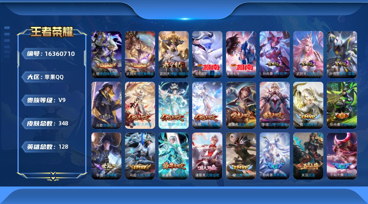 [16360710]【特价急出/详情看图】苹果Q-V9-最强王者段位-128英雄-348皮肤-2典藏皮肤-1典藏英雄-1无双-2珍品传说-3星元-32传说-96史诗