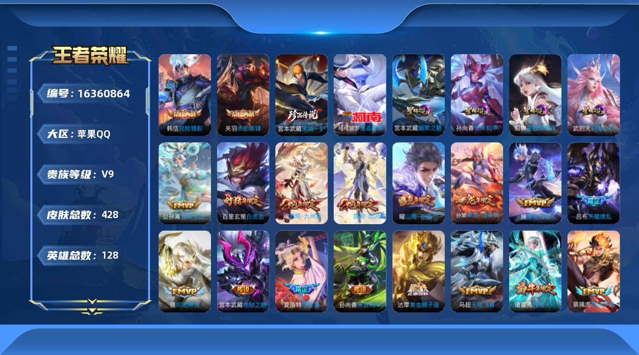 [16360864]【特价出售/店主推荐 打野37段 对抗路28段 7市标】苹果Q-V9-最强王者段位-128英雄-428皮肤-2典藏皮肤-1典藏英雄-4星传说-2珍品传说-32传说-121史诗 【英雄全皮】:刘禅全皮,阿轲全皮,刘邦全皮,孙权全皮,太乙真人全皮,司空震全皮,戈娅全皮,空空儿全皮,影全皮 【荣耀典藏】:武则天英雄,关羽赤影疾锋,韩信弑枪猎影 【珍品传说】:马可波罗怪盗基德,宫本武藏黑崎一护 【传说皮肤】:杨戬纵目迁山,后羿神树通天,公孙离云诺千山,司空震愿照山河定,澜愿照九州拓,云缨幻光神枪,裴擒虎祥瑞亨通,桑启鸣野蒿,孙策乘龙淬吴钩,澜逐花归海,夏洛特浮生妄,曜山海苍雷引,马超无双飞将,蔡文姬花朝如约,李元芳飞鸢探春,诸葛亮时雨天司,镜炽阳神光,虞姬启明星使,刘备时之恋人,张良黄金白羊座,干将莫邪久胜战神,虞姬云霓雀翎,达摩黄金狮子座,百里玄策白虎志,花木兰冠军飞将,梦奇胖达荣荣,后羿黄金射手座,貂蝉仲夏夜之梦,孙尚香末日机甲,宫本武藏地狱之眼,吕布天魔缭乱,武则天海洋之心 【限定皮肤】:白起狰,暃埋骨钱,蒙犽顽岩魄,蔡文姬夏日便利店,大乔绒语心约,虞姬夏日便利店,姜子牙天穹之誓,杨戬破阵退雄兵,李白谪仙醉月,狄仁杰阴阳师,赵云皇家上将,赵云龙胆,墨子神迹守卫,嬴政优雅恋人,嬴政白昼王子,高渐离死亡摇滚,阿轲迷踪丽影,钟无艳超时空战士,扁鹊奇幻香踪,芈月重明,吕布天魔缭乱,吕布猎兽之王,元歌云间偶戏,元歌无心,夏侯惇朔风刀,甄姬游园惊梦,甄姬落雪兰心,曹操烛龙,典韦穷奇,典韦蓝屏警告,马可波罗暗影游猎,狄仁杰魔术师,狄仁杰万华元夜,项羽海滩派对,老夫子醍醐杖,老夫子航海奇遇记,程咬金演武夺筹,露娜一生所爱,刘邦夺宝奇兵,王昭君午后时光,兰陵王金庭之子,花木兰青春决赛季,孙悟空至尊宝,孙悟空大圣娶亲,孙悟空孙行者,牛魔御旌,李元芳银河之约,李元芳云中旅人,虞姬启明星使,杨戬潮玩骑兵,女娲朔望之晖,雅典娜黎明之约,蔡文姬繁星吟游,太乙真人饕餮,太乙真人华丽摇滚,鬼谷子原初探秘者,鬼谷子五谷丰年,诸葛亮时雨天司,黄忠烈魂,百里玄策白虎志,百里玄策原初追逐者,弈星混沌棋,梦奇顽趣,沈梦溪星空之诺,沈梦溪大漠名商,明世隐疑决卦,裴擒虎天狼狩猎者,裴擒虎李小龙,裴擒虎擒涛扼浪,狂铁御狮,米莱狄御霄,云中君纤云弄巧,盾山御銮,猪八戒西部大镖客,上官婉儿梁祝,嫦娥拒霜思,嫦娥暖冬兔