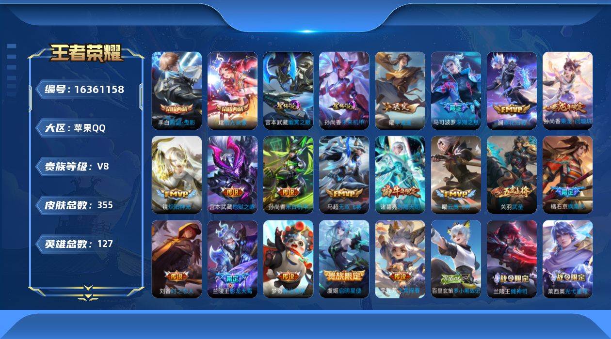 [16361158]可二次【特价出售/店主推荐/3401星币可兑换星元皮肤/1省标/4市标/36段打野】:苹果Q-V8-至尊星耀V段位-127英雄-354皮肤-2典藏皮肤-2星元-18传说-102史诗 【英雄全皮】:橘右京全皮,猪八戒全皮,鲁班大师全皮,戈娅全皮,影全皮 【荣耀典藏】:李白鸣剑曳影,瑶拾光映像 【传说皮肤】:后羿神树通天,孙尚香乘龙问璇玑,澜逐花归海,兰陵王影龙天霄,橘右京枫霜尽,马可波罗深海之息,马超无双飞将,曜李逍遥 ,李元芳飞鸢探春,诸葛亮时雨天司,镜炽阳神光,虞姬启明星使,关羽武圣,曜云鹰飞将,刘备时之恋人,梦奇胖达荣荣,孙尚香末日机甲,宫本武藏地狱之眼 【限定皮肤】:狄仁杰阴阳师,廉颇寅虎御盾,赵云皇家上将,赵云百木心枪,墨子神迹守卫,嬴政优雅恋人,孙尚香蔷薇恋人,鲁班七号狮舞东方,庄周高山流水,高渐离死亡摇滚,钟无艳超时空战士,扁鹊奇幻香踪,白起夜都怪侠,芈月重明,芈月幻夜卜梦,吕布御风骁将,元歌云间偶戏,元歌无心,夏侯惇朔风刀,夏侯惇匿光决锋者,甄姬游园惊梦,甄姬落雪兰心,曹操烛龙,典韦穷奇,马可波罗暗影游猎,马可波罗深海之息,狄仁杰魔术师,狄仁杰万华元夜,达摩星际陆战队,达摩沙漠行僧,项羽海滩派对,老夫子醍醐杖,老夫子航海奇遇记,关羽武圣,程咬金演武夺筹,韩信逐梦之影,王昭君午后时光,兰陵王影龙天霄,兰陵王金庭之子,橘右京枫霜尽,亚瑟潮玩骑士王,孙悟空孙行者,牛魔御旌,后羿辉光之辰,后羿圣弓游侠,李元芳云中旅人,虞姬霸王别姬,虞姬启明星使,钟馗神迹守卫,钟馗驱傩正仪,杨玉环遇见飞天,杨戬潮玩骑兵,干将莫邪冰霜恋舞曲,干将莫邪真爱魔法,雅典娜单词大作战,雅典娜黎明之约,太乙真人华丽摇滚,鬼谷子原初探秘者,鬼谷子五谷丰年,诸葛亮时雨天司,黄忠火炮绅士,苏烈千军破阵,百里玄策原初追逐者,弈星混沌棋,梦奇顽趣,公孙离玉兔公主,沈梦溪大漠名商,明世隐疑决卦,明世隐吟游魔法,裴擒虎天狼狩猎者,裴擒虎李小龙,裴擒虎擒涛扼浪,狂铁御狮,狂铁电玩高手,米莱狄御霄,米莱狄胡桃异想国,云中君纤云弄巧,盾山御銮,猪八戒西部大镖客,猪八戒猪悟能,上官婉儿梁祝,上官婉儿天狼绘梦者,嫦娥拒霜思,嫦娥暖冬兔眠,曜李逍遥 ,西施玲珑珍味,蒙犽狂想玩偶喵,鲁班大师匿光启智者,鲁班大师探海日志,镜匿光追影者,桑启海盐诗旅,暃星界游侠,戈娅驭风魔法,艾琳女武神,阿古朵江河有灵,张良古海寻踪,