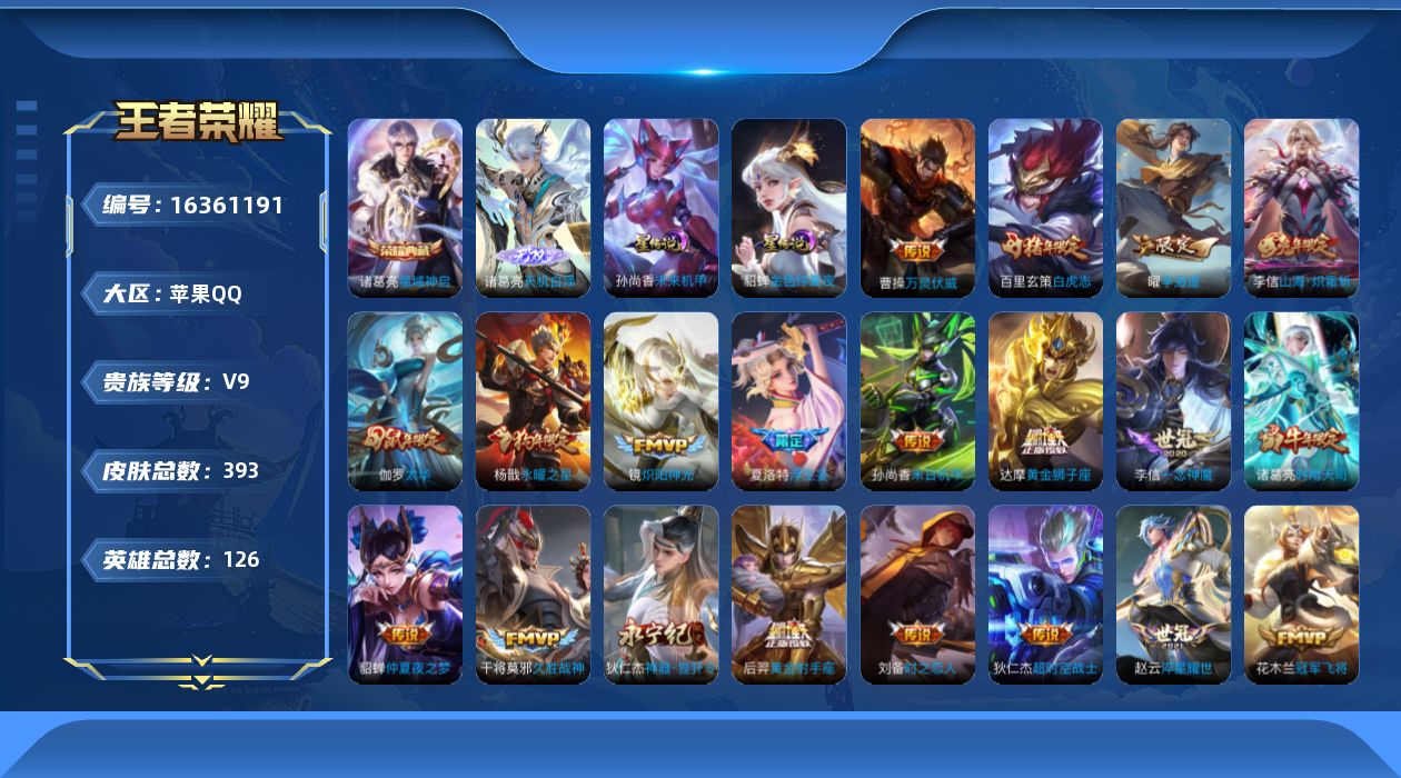 [16361191]【特价出售/店主推荐】:苹果Q-V9-最强王者段位-126英雄-393皮肤-1典藏皮肤-1无双-2星元-30传说-132史诗