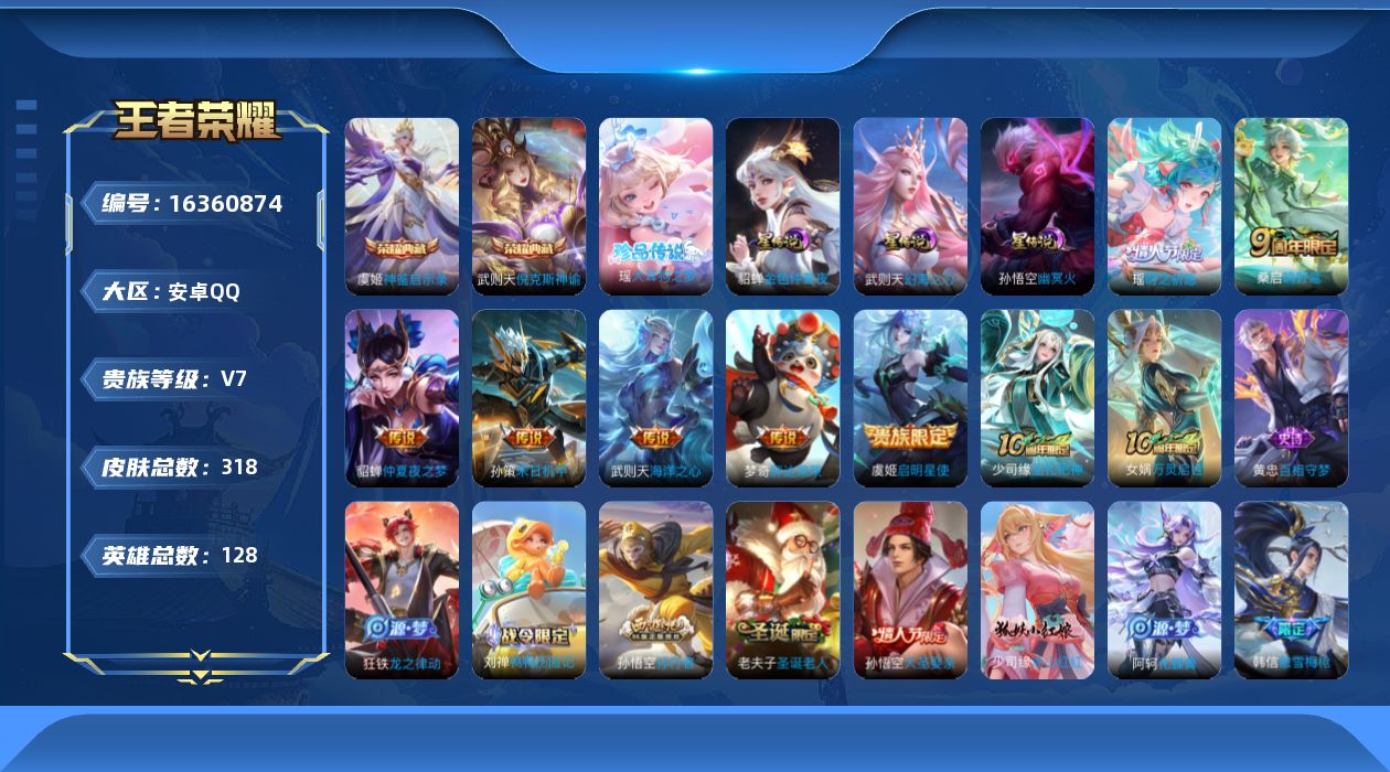 [16360874]可二次【特价出售/店主推荐 游走21段 2市标】安卓Q-V7-至尊星耀II段位-128英雄-318皮肤-2典藏皮肤-3星传说-1典藏英雄-1珍品传说-8传说-83史诗 【英雄全皮】:孙权全皮,钟馗全皮 【荣耀典藏】:武则天英雄,武则天倪克斯神谕,虞姬神鉴启示录 【珍品传说】:瑶大耳狗之梦 【传说皮肤】:后羿神树通天,桑启鸣野蒿,孙策末日机甲,瑶时之祈愿,虞姬启明星使,梦奇胖达荣荣,貂蝉仲夏夜之梦,武则天海洋之心 【限定皮肤】:姜子牙天穹之誓,狄仁杰阴阳师,赵云皇家上将,墨子神迹守卫,嬴政优雅恋人,孙尚香蔷薇恋人,鲁班七号狮舞东方,庄周高山流水,钟无艳超时空战士,白起夜都怪侠,芈月幻夜卜梦,周瑜赤莲之焰,元歌云间偶戏,夏侯惇朔风刀,甄姬女儿国国王,甄姬落雪兰心,曹操天狼征服者,狄仁杰魔术师,狄仁杰万华元夜,达摩星际陆战队,达摩沙漠行僧,项羽海滩派对,老夫子圣诞老人,老夫子醍醐杖,老夫子航海奇遇记,程咬金演武夺筹,韩信傲雪梅枪,兰陵王驯魔猎人,兰陵王金庭之子,亚瑟潮玩骑士王,孙悟空大圣娶亲,孙悟空孙行者,牛魔御旌,后羿圣弓游侠,李元芳云中旅人,虞姬启明星使,钟馗神迹守卫,钟馗驱傩正仪,杨玉环遇见飞天,干将莫邪真爱魔法,蔡文姬繁星吟游,鬼谷子原初探秘者,鬼谷子五谷丰年,黄忠火炮绅士,苏烈千军破阵,百里玄策原初追逐者,弈星混沌棋,梦奇顽趣,沈梦溪星空之诺,沈梦溪大漠名商,明世隐疑决卦,明世隐吟游魔法,裴擒虎李小龙,裴擒虎擒涛扼浪,米莱狄胡桃异想国,瑶时之祈愿,云中君纤云弄巧,云中君时之祈愿,伽罗天狼溯光者,盾山御銮,上官婉儿梁祝,嫦娥拒霜思,鲁班大师探海日志,镜匿光追影者,桑启海盐诗旅,艾琳女武神,阿古朵江河有灵,张良古海寻踪,鬼谷子天穹祈灯,李元芳蔬乡物语,刘邦剑破天穹 【赛季限定】:夏侯惇朔风刀,狄仁杰万华元夜,达摩沙漠行僧,老夫子醍醐杖,程咬金演武夺筹,兰陵王金庭之子,张良古海寻踪,牛魔御旌,李元芳云中旅人,钟馗驱傩正仪,鬼谷子原初探秘者,苏烈千军破阵,百里玄策原初追逐者,弈星混沌棋,梦奇顽趣,沈梦溪大漠名商,明世隐疑决卦,裴擒虎擒涛扼浪,盾山御銮,鲁班大师探海日志,桑启海盐诗旅,鬼谷子天穹祈灯,刘邦剑破天穹,姜子牙天穹之誓 【战令限定】:墨子神迹守卫,鲁班七号狮舞东方,钟无艳超时空战士,白起夜都怪侠,芈月幻夜卜梦,周瑜赤莲之焰,元歌云间偶戏,甄姬落雪兰心,达摩星际