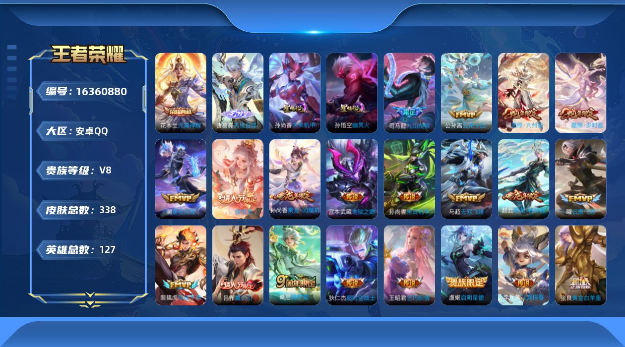 [16360880]可二次【特价出售/店主推荐】安卓Q-V8-最强王者段位-127英雄-337皮肤-1典藏皮肤-2星传说-1无双-22传说-93史诗 【英雄全皮】:孙权全皮,钟馗全皮,苍全皮,空空儿全皮,影全皮 【荣耀典藏】:花木兰九霄神辉 【无双皮肤】:诸葛亮天机白泽 【传说皮肤】:杨戬纵目迁山,后羿神树通天,司马懿九山相柳,公孙离云诺千山,西施续相思,澜愿照九州拓,虞姬愿照岁时盈,裴擒虎祥瑞亨通,桑启鸣野蒿,吕布曦玄引,孙尚香乘龙问璇玑,赵云乘龙铭钟鼎,澜逐花归海,马超无双飞将,王昭君乞巧织情,李元芳飞鸢探春,虞姬启明星使,曜云鹰飞将,张良黄金白羊座,孙尚香末日机甲,宫本武藏地狱之眼,狄仁杰超时空战士 【限定皮肤】:白起狰,蔡文姬夏日便利店,大乔绒语心约,虞姬夏日便利店,姜子牙天穹之誓,杨戬破阵退雄兵,狄仁杰阴阳师,虞姬凯尔特女王,赵云皇家上将,赵云百木心枪,孙尚香蔷薇恋人,鲁班七号狮舞东方,芈月重明,元歌无心,曹操烛龙,典韦穷奇,马可波罗山海玄木吟,狄仁杰魔术师,狄仁杰万华元夜,项羽海滩派对,老夫子醍醐杖,关羽百相守梦,韩信傲雪梅枪,兰陵王驯魔猎人,孙悟空至尊宝,牛魔御旌,李元芳云中旅人,虞姬启明星使,钟馗神迹守卫,钟馗驱傩正仪,杨玉环遇见飞天,杨玉环寅虎心曲,杨戬潮玩骑兵,蔡文姬繁星吟游,太乙真人饕餮,鬼谷子原初探秘者,百里玄策原初追逐者,弈星混沌棋,明世隐疑决卦,裴擒虎李小龙,裴擒虎擒涛扼浪,狂铁御狮,米莱狄御霄,米莱狄胡桃异想国,盾山御銮,上官婉儿神器万象笔,西施玲珑珍味,鲁班大师探海日志,桑启海盐诗旅,张良古海寻踪,高渐离燃音魔法,妲己灵卜魔法,鬼谷子天穹祈灯,孙尚香乘龙问璇玑,赵云乘龙铭钟鼎,吕布曦玄引,沈梦溪龙舞盛年,鲁班七号蔬乡物语,李元芳蔬乡物语,刘邦剑破天穹,程咬金群星魔术团,镜青焰无极,项羽苍威无极,刘备异域游侠,周瑜熔金海岸 【年限皮肤】:杨玉环寅虎心曲,马可波罗山海玄木吟,孙尚香乘龙问璇玑,赵云乘龙铭钟鼎 【赛季限定】:白起狰,芈月重明,曹操烛龙,典韦穷奇,狄仁杰万华元夜,老夫子醍醐杖,张良古海寻踪,牛魔御旌,李元芳云中旅人,虞姬凯尔特女王,钟馗驱傩正仪,太乙真人饕餮,鬼谷子原初探秘者,百里玄策原初追逐者,弈星混沌棋,明世隐疑决卦,裴擒虎擒涛扼浪,狂铁御狮,米莱狄御霄,盾山御銮,鲁班大师探海日志,桑启海盐诗旅,鬼谷子天穹祈灯,刘邦剑破天穹,姜子牙天穹之誓