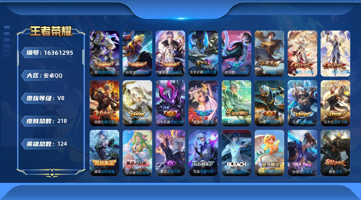 [16361295]可二次【特价出售/店主推荐】对抗32段,安卓Q-V8-最强王者段位-124英雄-218皮肤-3典藏皮肤-1星传说-13传说-60史诗 【荣耀典藏】:孙悟空全息碎影,诸葛亮星域神启,铠银白咏叹调 【传说皮肤】:司马懿九山相柳,司空震愿照山河定,澜愿照九州拓,桑启鸣野蒿,夏洛特浮生妄,吕布怒海麟威,孙策末日机甲,曜李逍遥 ,镜炽阳神光,虞姬启明星使,花木兰冠军飞将,杨戬永曜之星,宫本武藏地狱之眼 【限定皮肤】:蒙犽顽岩魄,姜子牙天穹之誓,狄仁杰阴阳师,赵云皇家上将,赵云百木心枪,孙尚香蔷薇恋人,钟无艳超时空战士,扁鹊奇幻香踪,甄姬落雪兰心,典韦岱宗,马可波罗暗影游猎,狄仁杰魔术师,项羽海滩派对,老夫子圣诞老人,王昭君午后时光,兰陵王金庭之子,孙悟空至尊宝,孙悟空孙行者,刘备百相守梦,李元芳云中旅人,虞姬启明星使,杨戬永曜之星,杨戬潮玩骑兵,雅典娜黎明之约,鬼谷子五谷丰年,百里玄策原初追逐者,沈梦溪大漠名商,裴擒虎擒涛扼浪,狂铁电玩高手,嫦娥暖冬兔眠,曜李逍遥 ,鲁班大师探海日志,桑启海盐诗旅,夏洛特浮生妄,暃星界游侠,张良古海寻踪,蒙恬荣光圣徽,鬼谷子天穹祈灯,鲁班七号蔬乡物语,李元芳蔬乡物语,刘邦剑破天穹,镜青焰无极,项羽苍威无极,周瑜熔金海岸 【年限皮肤】:杨戬永曜之星,典韦岱宗 【赛季限定】:兰陵王金庭之子,张良古海寻踪,李元芳云中旅人,雅典娜黎明之约,百里玄策原初追逐者,沈梦溪大漠名商,裴擒虎擒涛扼浪,鲁班大师探海日志,桑启海盐诗旅,鬼谷子天穹祈灯,蒙恬荣光圣徽,刘邦剑破天穹,姜子牙天穹之誓 【战令限定】:钟无艳超时空战士,扁鹊奇幻香踪,甄姬落雪兰心,马可波罗暗影游猎,王昭君午后时光,杨戬潮玩骑兵,狂铁电玩高手,嫦娥暖冬兔眠,暃星界游侠,鲁班七号蔬乡物语,李元芳蔬乡物语,镜青焰无极,项羽苍威无极 【史诗皮肤】:鲁班七号电玩小子,项羽苍穹之光,露娜紫霞仙子,阿轲暗夜猫娘,赵云皇家上将,赵云未来纪元,貂蝉圣诞恋歌,老夫子圣诞老人,甄姬冰雪圆舞曲,王昭君偶像歌手,狄仁杰魔术师,廉颇地狱岩魂,宫本武藏鬼剑武藏,孙尚香蔷薇恋人,孙尚香水果甜心,妲己魅力维加斯,妲己女仆咖啡,墨子龙骑士,墨子金属风暴,吕布圣诞狂欢,曹操幽灵船长,李白千年之狐,吕布末日机甲,韩信白龙吟,孙悟空至尊宝,花木兰水晶猎龙者,刘邦德古拉伯爵,夏侯惇乘风破浪,兰陵王暗隐猎兽者,亚瑟心灵战警,安琪拉心灵