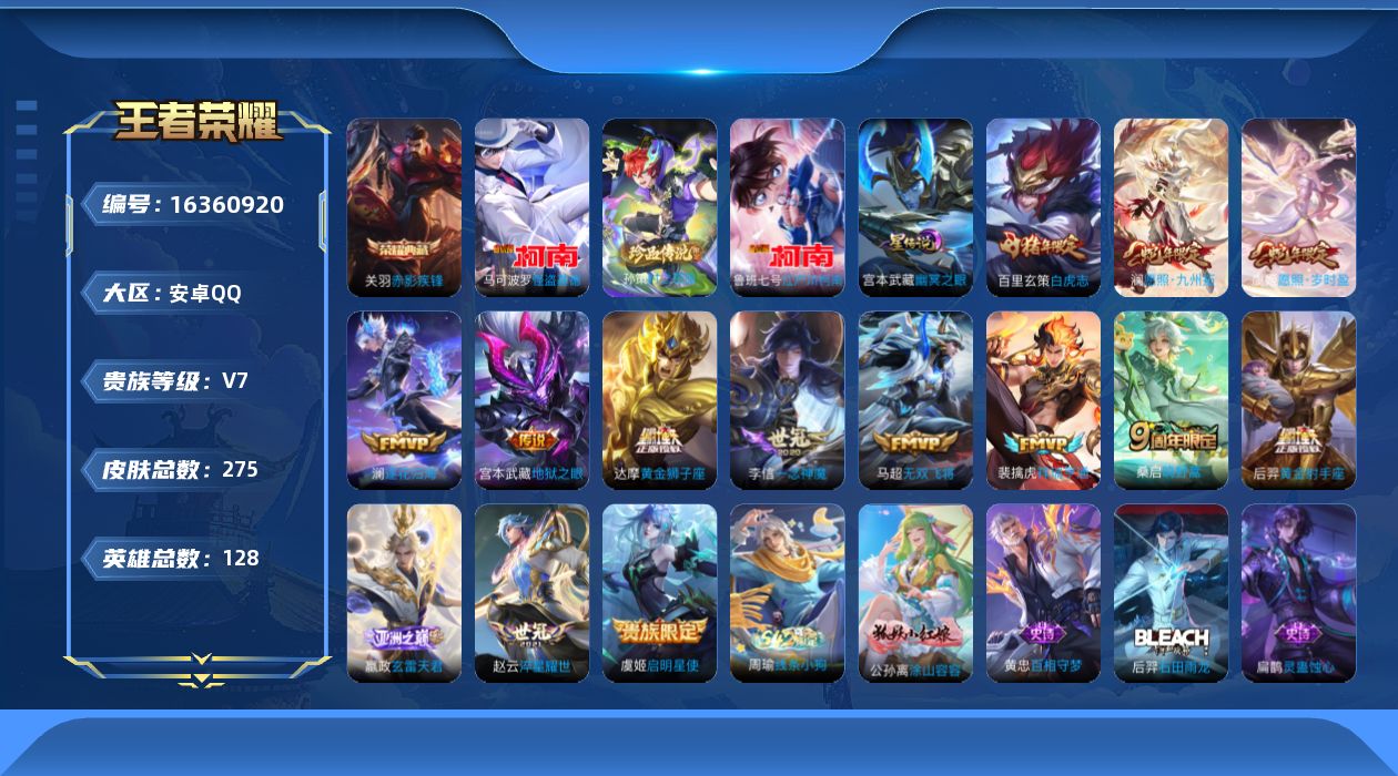[16360920]【特价出售/店主推荐】安卓Q-V7-永恒钻石I段位-128英雄-273皮肤-1典藏皮肤-3珍品传说-1星传说-15传说-77史诗