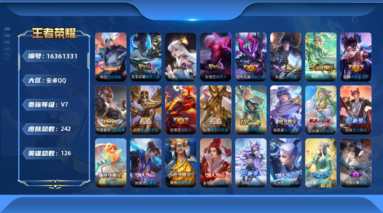 - [12198791]V8 1典藏 21传说 123英雄 256皮肤 可修改实名 女号 优质装备:星域神启(倪克斯贼亮),黄金射手座,绛天战甲(鸡嘴战神),炽阳神光,仲夏夜之梦(大飞蛾),零号·赤焰,地狱之眼,胖达荣荣,乞巧织情,时之恋人-刘备(电焊工),淬星耀世,音你闪耀(rap皮),浮生妄 珍宝阁皮:女武神,玩趣恶龙 限定皮:至尊宝,太华(伽罗年限),异界灵契(白毛香),傲雪梅枪,星穹之声,时之彼端,神威(电光马子),瑞麟志(木兰年限),遇见飞天,高山流水,诗剑行,匿光决锋者,怒海麟威,降魔,五谷丰年,天狼溯光者,李小龙,朱雀志(守约年限),孙行者,匿光追影者,女儿国国王,玉兔公主,启示之音,深海之息(深海大菠萝),枫霜尽,时之奇旅-妲己 史诗皮:遇见神鹿,紫霞仙子,苍穹之光,电玩小子(小书包),黄金分割率,千年之狐,冰冠公主,青蛇,偶像歌手,白蛇,晚萤,暗夜猫娘,银翎春语,末日机甲-吕布,猫狗日记-孙策,时之恋人-孙尚香,乱世虎臣,节奏热浪,女仆咖啡,摇滚巨星,水果甜心,时之奇旅-安琪拉,功夫厨神,德古拉伯爵,幽灵船长,鬼剑武藏,心灵战警,舞动绿茵,诗语江南,拒霜思,缤纷独角兽,乘风破浪,月团寄思,水晶猎龙者,曙光守护者,热力回旋,箭羽风息,唤灵魅影,金属风暴,圣诞狂欢,圣诞恋歌,鹰眼统帅,魅力维加斯,无心,未来纪元-赵云