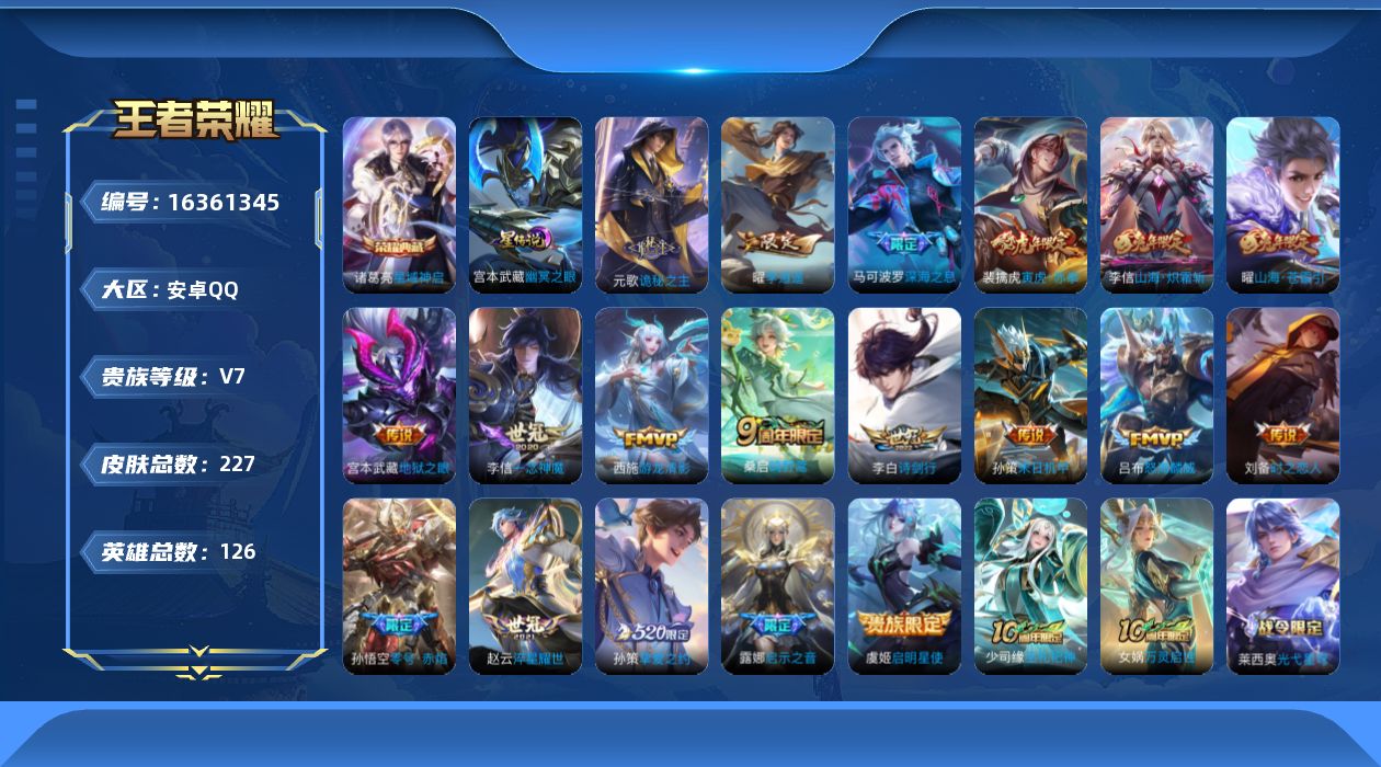 [16361345]可二次【特价出售/店主推荐】对抗路32段,安卓Q-V7-最强王者段位-126英雄-227皮肤-1典藏皮肤-1星传说-20传说-69史诗