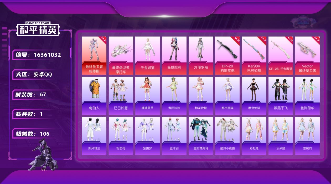 [16361032]可二次【特价急出/详情看图】安卓 手Q-1神装-3粉装-4特效枪-1载具-2粉色飞行器-34754热力值-6王牌印记-67套装-106枪皮