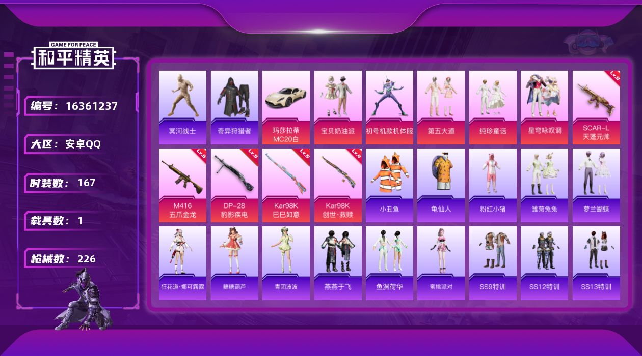 [16361237]【特价出售/店主推荐】安卓 手Q-5粉装-5特效枪-1载具-1粉色飞行器-72208热力值-16王牌印记-167套装-226枪皮【热门品类】:套装-冥河战士,套装-小丑鱼,套装-奇异狩猎者,套装-龟仙人,套装-粉红小【粉色套装】:粉装-宝贝奶油派,角色-初号机款机体服,粉装-第五大道,粉装-纯珍童话,粉装-星穹咏叹调【粉色枪皮等级】:SCAR-L-天蓬元帅(九级),M416-五爪金龙(六级),Kar98K-创世·救赎(四级),Kar98K-巳巳如意(五级),DP-28-豹影疾电(五级)【粉色载具】:玛莎拉蒂MC20(星石【粉色枪皮】:SCAR-L-天蓬元帅,M416-五爪金龙,Kar98K-创世·救赎,Kar98K-巳巳如意,DP-28-豹影疾电【粉色飞行器】:星夜魔法师飞行翼