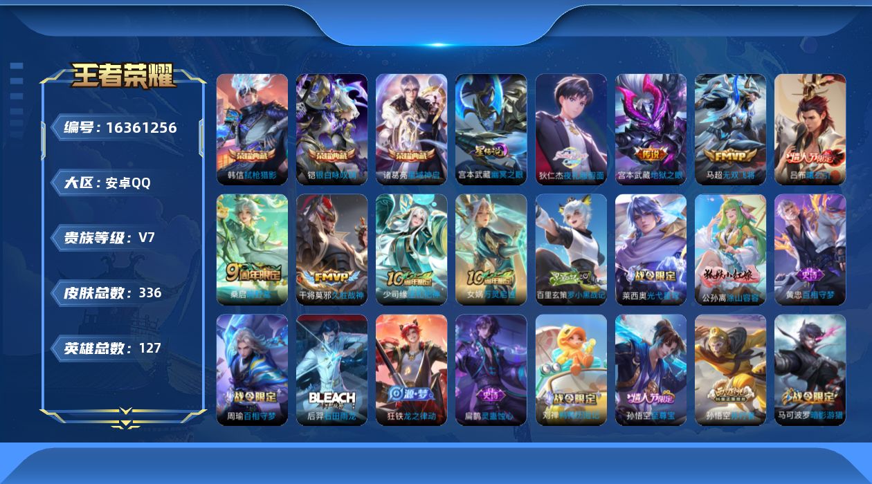 [16361256]【特价出售/店主推荐】万战金标黄忠、万战金标莱西奥、万战金标孙悟空、金标李元芳、金标韩信、金标典韦、发育路57段、打野45段、对抗路34段,安卓Q-V7-最强王者段位-127英雄-336皮肤-3典藏皮肤-1星传说-7传说-100史诗 【英雄全皮】:狂铁全皮,莱西奥全皮,影全皮 【荣耀典藏】:诸葛亮星域神启,铠银白咏叹调,韩信弑枪猎影 【传说皮肤】:后羿神树通天,桑启鸣野蒿,吕布曦玄引,狄仁杰夜礼服假面,马超无双飞将,干将莫邪久胜战神,宫本武藏地狱之眼 【限定皮肤】:蒙犽顽岩魄,蔡文姬夏日便利店,虞姬夏日便利店,姜子牙天穹之誓,杨戬破阵退雄兵,狄仁杰阴阳师,赵云皇家上将,墨子神迹守卫,嬴政白昼王子,孙尚香蔷薇恋人,高渐离死亡摇滚,阿轲迷踪丽影,钟无艳超时空战士,扁鹊奇幻香踪,吕布猎兽之王,元歌云间偶戏,元歌无心,夏侯惇朔风刀,甄姬游园惊梦,甄姬落雪兰心,马可波罗暗影游猎,狄仁杰魔术师,狄仁杰万华元夜,达摩沙漠行僧,项羽海滩派对,老夫子醍醐杖,老夫子航海奇遇记,程咬金演武夺筹,刘邦夺宝奇兵,王昭君午后时光,兰陵王金庭之子,孙悟空至尊宝,孙悟空大圣娶亲,孙悟空孙行者,牛魔御旌,后羿圣弓游侠,李元芳云中旅人,钟馗驱傩正仪,杨戬潮玩骑兵,干将莫邪胡桃夹子,雅典娜黎明之约,鬼谷子原初探秘者,鬼谷子五谷丰年,苏烈千军破阵,百里玄策原初追逐者,弈星混沌棋,梦奇顽趣,沈梦溪大漠名商,明世隐疑决卦,裴擒虎李小龙,裴擒虎擒涛扼浪,狂铁御狮,狂铁电玩高手,米莱狄御霄,米莱狄胡桃异想国,云中君纤云弄巧,盾山御銮,上官婉儿梁祝,嫦娥拒霜思,嫦娥暖冬兔眠,西施玲珑珍味,鲁班大师探海日志,桑启海盐诗旅,暃星界游侠,艾琳流音漫舞,阿古朵江河有灵,张良古海寻踪,狄仁杰夜礼服假面,蒙犽百解令,蒙恬荣光圣徽,鬼谷子天穹祈灯,姬小满妄想食味,吕布曦玄引,沈梦溪龙舞盛年,鲁班七号蔬乡物语,李元芳蔬乡物语,刘邦剑破天穹,程咬金群星魔术团,镜青焰无极,项羽苍威无极,周瑜熔金海岸 【赛季限定】:夏侯惇朔风刀,狄仁杰万华元夜,达摩沙漠行僧,老夫子醍醐杖,程咬金演武夺筹,兰陵王金庭之子,张良古海寻踪,牛魔御旌,李元芳云中旅人,钟馗驱傩正仪,雅典娜黎明之约,鬼谷子原初探秘者,苏烈千军破阵,百里玄策原初追逐者,弈星混沌棋,梦奇顽趣,沈梦溪大漠名商,明世隐疑决卦,裴擒虎擒涛扼浪,狂铁御狮,米莱狄御霄,盾山御銮,鲁班大师探海