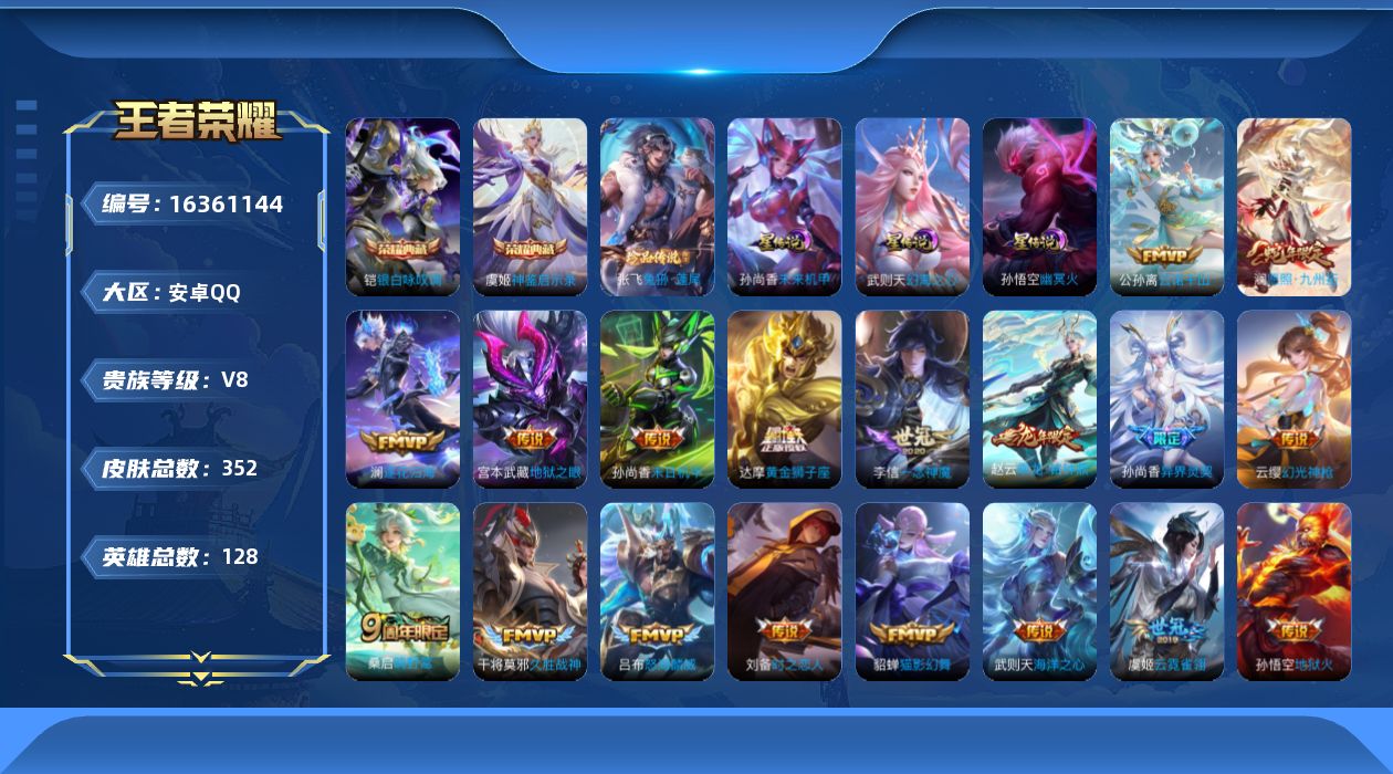 [16361144]可二次【特价出售/店主推荐】:安卓Q-V8-最强王者段位-128英雄-352皮肤-2典藏皮肤-1典藏英雄-1珍品传说-4星元-21传说-103史诗