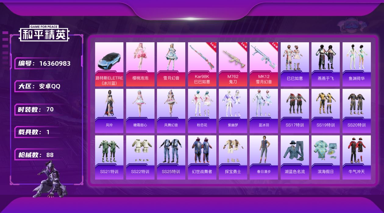 [16360983]可二次【特价出售/店主推荐】安卓 手Q-2粉装-3特效枪-1载具-1粉色飞行器-28374热力值-5王牌印记-70套装-88枪皮 【粉色套装】:角色-樱桃泡泡,粉装-雪月幻音 【粉色枪皮等级】:M762-鬼刀(四级),Kar98K-巳巳如意(五级),MK12-雪月幻音(四级) 【粉色载具】:路特斯ELETRE(冰川蓝) 【粉色枪皮】:M762-鬼刀,Kar98K-巳巳如意,MK12-雪月幻音 【粉色飞行器】:月下星之子飞行器 【粉色降落伞】:洛神天依降落伞,旋转彩虹降落伞,精灵梦叶罗丽降落伞,动力核心降落伞,鬼刀降落伞,赛博古神降落伞,彩虹独角兽降落伞,雪月幻音降落伞 【稀有套装】:套装-巳巳如意,套装-燕燕于飞,套装-鱼渊荷华,角色-风玲,角色-糖霜甜心,套装-风舞幻音,套装-粉恋花,套装-紫幽梦,套装-蓝冰羽 【稀有枪皮】:AKM-生命誓言,AKM-破晓战魂,AKM-虎虎生威,AKM-龙的传人,M16A4-幻世战舞者,M16A4-甜心亚梦,SCAR-L-夜灯,SCAR-L-炫彩节奏,SCAR-L-玉兔迎春,M416-糯团青竹,M416-红色方程式,AUG-耀粉歌者,QBZ-彩虹符号,M762-彩虹符号,M762-牛气冲天,M762-瑞龙福将,M762-镭射皇者,M762-幻影飞狐,AC-VAL-天降萌叽,AC-VAL-甜心亚梦,蜜獾-垂柳戏鸭,蜜獾-娇憨猪猪,UZI-娇憨猪猪,UZI-炫彩节奏,UZI-红色方程式,Vector-生命誓言,汤姆逊-天降萌叽,汤姆逊-樱桃泡泡,AKS-74U-鬼刀,P90-巳巳如意,Kar98K-彩虹符号,Kar98K-王子的夏天,M24-炫彩节奏,SKS-圣域龙灵,Mini14-炫彩节奏,Win94-瑞龙福将,SLR-娇憨猪猪,AMR-鬼刀,M417-幻影飞狐,S686-红色方程式,S686-雪月幻音,S686-巳巳如意,S1897-炫彩节奏,S12K-玩趣呆呆,S12K-瑞龙福将,S12K-破晓战魂,S12K-娇憨猪猪,DBS-甜心亚梦,DBS-月下星之子,M249-彩虹符号,DP-28-甜心亚梦,MG3-瑞龙福将,P1911-小狗蛇点点,TMP-9-雪月幻音,爆炸猎弓-雪月幻音,大砍刀-鬼刀,撬棍-脆鲨七海,破片手榴弹-巳巳如意 【其他套装】:套装-SS17特训,套装-SS19特训,套装-SS20特训,套装-SS21特训,套