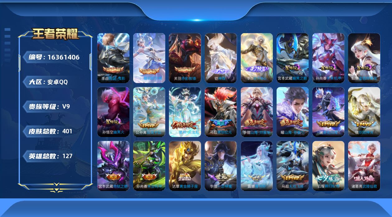 [16361406]【特价出售/店主推荐】对抗路30段,安卓Q-V9-最强王者段位-127英雄-401皮肤-3典藏皮肤-2无双-5星传说-31传说-129史诗 【英雄全皮】:阿轲全皮,达摩全皮,关羽全皮,刘邦全皮,李信全皮,马超全皮 【荣耀典藏】:李白鸣剑曳影,关羽赤影疾锋,伽罗最初的交响 【无双皮肤】:李白碎月剑心,铠神罪 【传说皮肤】:后羿神树通天,公孙离云诺千山,妲己愿照众生和,云缨幻光神枪,桑启鸣野蒿,马超琥珀纪元,澜逐花归海,露娜霜月吟,宫本武藏惊梅引,云缨鹤归松栖,孙悟空齐天大圣,曜山海苍雷引,李信山海炽霜斩,吕布怒海麟威,李白诗剑行,马超无双飞将,孙策末日机甲,赵云淬星耀世,镜炽阳神光,虞姬启明星使,关羽武圣,曜云鹰飞将,李信一念神魔,刘备时之恋人,干将莫邪久胜战神,达摩黄金狮子座,诸葛亮武陵仙君,貂蝉仲夏夜之梦,孙尚香末日机甲,宫本武藏地狱之眼,孙悟空地狱火 【限定皮肤】:白起狰,蔡文姬夏日便利店,虞姬夏日便利店,姜子牙天穹之誓,狄仁杰阴阳师,赵云皇家上将,墨子神迹守卫,妲己时之奇旅,嬴政优雅恋人,嬴政白昼王子,孙尚香蔷薇恋人,庄周高山流水,阿轲迷踪丽影,钟无艳王者之锤,钟无艳超时空战士,白起夜都怪侠,芈月白晶晶,芈月幻夜卜梦,吕布猎兽之王,周瑜赤莲之焰,元歌云间偶戏,元歌无心,夏侯惇朔风刀,甄姬落雪兰心,曹操烛龙,典韦蓝屏警告,典韦岱宗,马可波罗暗影游猎,马可波罗山海玄木吟,狄仁杰魔术师,狄仁杰万华元夜,达摩星际陆战队,达摩沙漠行僧,项羽海滩派对,老夫子醍醐杖,老夫子航海奇遇记,关羽冰锋战神,关羽武圣,关羽百相守梦,程咬金演武夺筹,露娜一生所爱,刘邦夺宝奇兵,韩信逐梦之影,韩信飞衡,韩信傲雪梅枪,王昭君午后时光,兰陵王驯魔猎人,兰陵王金庭之子,花木兰青春决赛季,花木兰瑞麟志,亚瑟潮玩骑士王,孙悟空至尊宝,孙悟空大圣娶亲,孙悟空孙行者,孙悟空齐天大圣,牛魔御旌,后羿圣弓游侠,李元芳银河之约,李元芳云中旅人,虞姬启明星使,钟馗驱傩正仪,女娲朔望之晖,干将莫邪冰霜恋舞曲,干将莫邪真爱魔法,雅典娜单词大作战,雅典娜黎明之约,蔡文姬繁星吟游,太乙真人饕餮,鬼谷子原初探秘者,鬼谷子五谷丰年,诸葛亮武陵仙君,黄忠火炮绅士,苏烈千军破阵,百里玄策原初追逐者,百里守约朱雀志,弈星混沌棋,梦奇顽趣,沈梦溪星空之诺,沈梦溪大漠名商,明世隐疑决卦,明世隐吟游魔法,裴擒虎天狼狩猎者,裴擒虎李