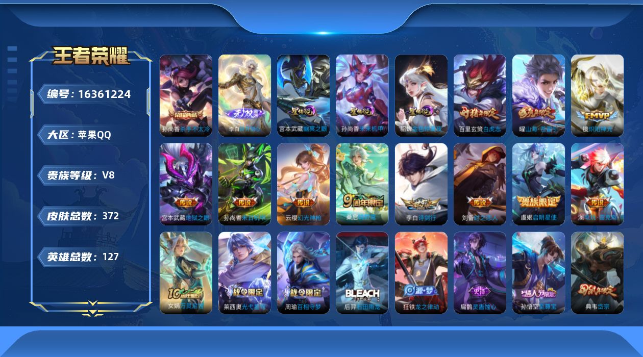 - [12138651]V8 1典藏 2珍品传说 17传说 124英雄 376皮肤 可修改实名 优质装备:鸣剑·曳影,江户川柯南,怪盗基德,黄金射手座,云鹰飞将(小将军),一念神魔,末日机甲-孙尚香(绿蚂蚱),地狱火,零号·赤焰,淬星耀世,无双飞将,澜逐花归海,牧神诗旅 传说皮:典韦战鼓燎原,幻光神枪 珍宝阁皮:妄想食味,蔷薇恋人,女武神 限定皮:陌上桑,鸣野蒿,夏侯惇霜北刀,至尊宝,白虎志(电光耗子),傲雪梅枪,白晶晶,时雨天司(水龙头),飞衡(韩信年限),遇见飞天,高山流水,五谷丰年,梁祝,御风骁将(吕布年限),天狼溯光者,李小龙,霸王别姬-虞姬,孙行者,猪悟能,冰霜恋舞曲,百木心枪 史诗皮:鸭鸭历险记-刘禅,器灵·浮梦炉,谪仙醉月,龙之律动,百相守梦-周瑜,茶境仙,炽弈燎原,破空之剑,涂山红红,东方月初,蒙犽顽岩魄,埋骨钱,百相守梦-黄忠,紫霞仙子,苍穹之光,电玩小子(小书包),黄金分割率,特工魅影,千年之狐,永昼,魅语,蒙恬荣光圣徽,无限星赏官,冰冠公主,青蛇,偶像歌手,晚萤,电玩·爆裂旋风,暗夜猫娘,末日机甲-吕布,猫狗日记-孙策,猫狗日记-大乔,时之恋人-孙尚香,乱世虎臣,节奏热浪,修罗,女仆咖啡,摇滚巨星,水果甜心,绅士熊喵,天才门将,星夜王子,心灵骇客,时之奇旅-安琪拉,功夫厨神,德古拉伯爵,暗隐猎兽者,幽灵船长,鬼剑武藏,暗渊魔法,心灵战警,乐园奇幻夜,天秀·启明,舞动绿茵,地狱岩魂,诗语江南,纤云弄巧,繁星吟游(呼啦呼啦),拒霜思,缤纷独角兽,乘风破浪,逐浪之夏,水晶猎龙者,曙光守护者,箭羽风息,金属风暴,原初追逐者,圣诞狂欢,圣诞恋歌,鹰眼统帅,暗夜贵公子,魅力维加斯,黎明之约,未来纪元-赵云
