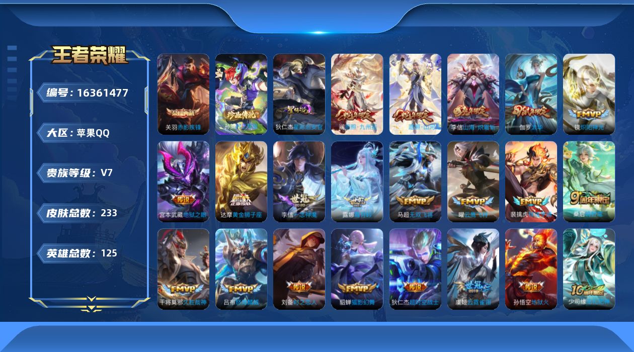 - [11578844]V7 1典藏 10传说 124英雄 275皮肤 可修改实名 优质装备:拾光映像(瑶典藏),黄金狮子座,黄金射手座,久胜战神,末日机甲-孙尚香(绿蚂蚱),仲夏夜之梦(大飞蛾),李逍遥,游龙清影(小青龙) 传说皮:云诺千山 珍宝阁皮:妄想食味,优雅恋人 限定皮:鸣野蒿,至尊宝,白鹤梁神女,时雨天司(水龙头),高山流水,冰锋战神,游园惊梦,梁祝,天狼溯光者,李小龙,默契交锋-花木兰,大圣娶亲 史诗皮:鸭鸭历险记-刘禅,星界战将,龙之律动,雪豹·霜爪,茶境仙,破空之剑,百相守梦-百里守约,百相守梦-黄忠,紫霞仙子,黄金分割率,特工魅影,千年之狐,百解令(蒙犽),偶像歌手,龙骑士(小龙虾),魅语,冰冠公主,青蛇,猫狗日记-孙策,乱世虎臣,节奏热浪,修罗,水果甜心,天才门将,星夜王子,心灵骇客,暗隐猎兽者,幽灵船长,心灵战警,乐园奇幻夜,天秀·启明,地狱岩魂,纤云弄巧,繁星吟游(呼啦呼啦),拒霜思,乘风破浪,逐浪之夏,月团寄思,水晶猎龙者,曙光守护者,金属风暴,原初追逐者,圣诞狂欢,圣诞恋歌,鹰眼统帅,魅力维加斯,黎明之约