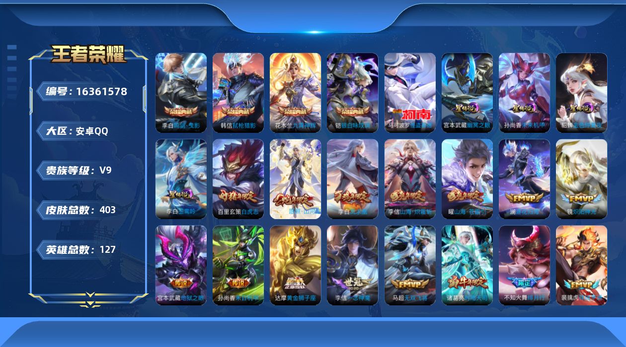 [16361578]【店主推荐捡漏号!可直接换绑】安卓Q-V9-最强王者段位-127英雄-403皮肤-4典藏皮肤-1珍品传说-32传说-121史诗