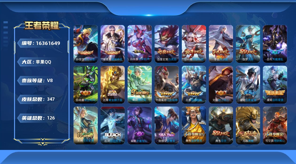 [16361649]【特价出售/店主推荐】对抗路36段、打野30段,苹果Q-V8-最强王者段位-126英雄-347皮肤-2典藏皮肤-1星传说-13传说-102史诗