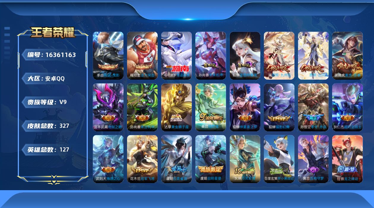 [16361163]【特价出售/店主推荐/1省标/市标/31段对抗】:安卓Q-V9-最强王者段位-127英雄-327皮肤-2典藏皮肤-1典藏英雄-1珍品传说-2星元-16传说-87史诗