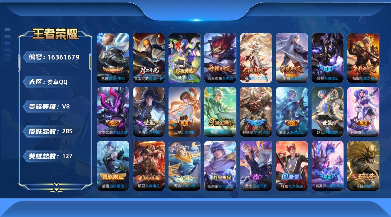 [16361679]安卓Q-V8-至尊星耀IV段位-127英雄-285皮肤-1典藏皮肤-2珍品传说-14传说-73史诗【荣耀典藏】:李白鸣剑曳影【珍品传说】:孙策时之奇旅,宫本武藏黑崎一护【传说皮肤】:澜愿照九州拓,云缨幻光神枪,桑启鸣野蒿,孙尚香音你闪耀,赵云淬星耀世,虞姬启明星使,孙悟空零号赤焰,李信一念神魔,百里玄策白虎志,杨戬永曜之星,李白凤求凰,宫本武藏地狱之眼,吕布天魔缭乱,武则天海洋之心【限定皮肤】:白起狰,姜子牙天穹之誓,狄仁杰阴阳师,虞姬凯尔特女王,赵云皇家上将,赵云引擎之心,墨子神迹守卫,孙尚香蔷薇恋人,鲁班七号狮舞东方,庄周蜃楼王,高渐离死亡摇滚,孙膑妖精王,扁鹊炼金王,芈月重明,吕布天魔缭乱,吕布御风骁将,周瑜赤莲之焰,元歌无心,夏侯惇朔风刀,曹操烛龙,典韦穷奇,狄仁杰魔术师,狄仁杰万华元夜,达摩沙漠行僧,项羽海滩派对,项羽霸王别姬,老夫子圣诞老人,老夫子醍醐杖,老夫子航海奇遇记,关羽冰锋战神,貂蝉逐梦之音,程咬金演武夺筹,韩信逐梦之影,兰陵王驯魔猎人,兰陵王金庭之子,亚瑟狮心王,孙悟空美猴王,孙悟空零号赤焰,牛魔御旌,李元芳云中旅人,虞姬启明星使,钟馗神迹守卫,钟馗驱傩正仪,杨玉环遇见飞天,杨戬永曜之星,干将莫邪冰霜恋舞曲,雅典娜黎明之约,太乙真人饕餮,太乙真人华丽摇滚,鬼谷子原初探秘者,鬼谷子五谷丰年,铠青龙志,苏烈千军破阵,百里玄策白虎志,百里玄策原初追逐者,弈星混沌棋,梦奇顽趣,沈梦溪大漠名商,明世隐疑决卦,裴擒虎天狼狩猎者,裴擒虎李小龙,裴擒虎擒涛扼浪,狂铁御狮,米莱狄御霄,盾山御銮,嫦娥拒霜思,鲁班大师探海日志,桑启海盐诗旅,阿古朵江河有灵,张良古海寻踪,鬼谷子天穹祈灯,刘邦剑破天穹,程咬金群星魔术团,周瑜熔金海岸 【年限皮肤】:孙悟空美猴王,李白凤求凰,杨戬永曜之星,百里玄策白虎志,铠青龙志,吕布御风骁将,澜愿照九州拓 【赛季限定】:亚瑟狮心王,庄周蜃楼王,孙膑妖精王,扁鹊炼金王,虞姬凯尔特女王,白起狰,太乙真人饕餮,曹操烛龙,芈月重明,典韦穷奇,狂铁御狮,米莱狄御霄,牛魔御旌,盾山御銮,夏侯惇朔风刀,弈星混沌棋,明世隐疑决卦,老夫子醍醐杖,鬼谷子原初探秘者,狄仁杰万华元夜,程咬金演武夺筹,钟馗驱傩正仪,苏烈千军破阵,达摩沙漠行僧,兰陵王金庭之子,沈梦溪大漠名商,李元芳云中旅人,桑启海盐诗旅,裴擒虎擒涛扼浪,鲁班大师探海日志,张良古海寻踪,鬼谷子