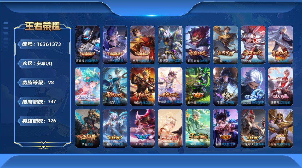 - [11684236]V9 2典藏 2无双 2珍品传说 30传说 125英雄 297皮肤 可修改实名 优质装备:天鹅之梦(小乔典藏),大秦宣太后,真我赫兹(瑶)(瑶无双),小乔时之魔女(小乔无双),酷洛米之心,大耳狗之梦,黄金狮子座,云鹰飞将(小将军),猫影幻舞,久胜战神,炽阳神光,一念神魔,云霓雀翎,末日机甲-孙尚香(绿蚂蚱),地狱火,仲夏夜之梦(大飞蛾),音你心动-小乔,胖达荣荣,乞巧织情,游龙清影(小青龙),遇见胡旋,花朝如约(花篮子),挚爱花嫁,霜月吟,澜逐花归海,涂山容容 传说皮:祥瑞亨通 珍宝阁皮:万物之道,女武神 限定皮:愿照·九州拓(澜年限),愿照·福禄聚(蔡文姬年限),愿照·岁时盈(虞姬年限),愿照·众生和(妲己年限),映山客,鸣野蒿,凤凰于飞,傲雪梅枪,寅虎·展翼(孙膑年限),白鹤梁神女,白晶晶,时雨天司(水龙头),遇见飞天,高山流水,天狼运算者,梁祝,天狼溯光者,逐梦之音,奔雷神使(牛魔年限),祈雪灵祝(雪兔子),天狼绘梦者,如梦令-嫦娥,霸王别姬-虞姬,奇迹圣诞,默契交锋-花木兰,纯白花嫁,一生所爱,蜜橘之夏,匿光追影者,女儿国国王,寅虎·心曲(虎婆),时之祈愿-云中君,时之祈愿-瑶(瑶传限),玉兔公主 史诗皮:化蝶舞,龙之律动,布丁狗之誓,石田雨龙,百相守梦-周瑜,百相守梦-黄忠,织梦人,遇见神鹿,紫霞仙子,特工魅影,千年之狐,江河有灵,鹤归松栖(赵怀真),魅语,百解令(蒙犽),无限星赏官,冰冠公主,青蛇,偶像歌手,白蛇,晚萤,猫狗日记-孙策,猫狗日记-大乔,时之恋人-孙尚香,乱世虎臣,修罗,女仆咖啡,摇滚巨星,水果甜心,绅士熊喵,心灵骇客,功夫厨神,暗隐猎兽者,幽灵船长,鬼剑武藏,舞动绿茵,地狱岩魂,诗语江南,纤云弄巧,繁星吟游(呼啦呼啦),拒霜思,缤纷独角兽,逐浪之夏,曙光守护者,箭羽风息,唤灵魅影,金属风暴,圣诞狂欢,圣诞恋歌,鹰眼统帅,黎明之约,奇遇舞章