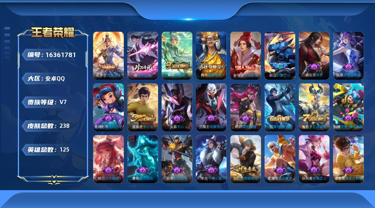[16361781]账号来源干净 保证账号找回包赔 薄利多销 冲销量 平台保证金向商家 安卓Q-V7-至尊星耀V段位-125英雄-238皮肤-1典藏皮肤-1珍品传说-2传说-57史诗【英雄全皮】:空空儿全皮【荣耀典藏】:花木兰九霄神辉【珍品传说】:暃朽木白哉【传说皮肤】:后羿神树通天,桑启鸣野蒿【限定皮肤】:白起狰,狄仁杰阴阳师,虞姬凯尔特女王,赵云皇家上将,赵云引擎之心,孙尚香蔷薇恋人,鲁班七号狮舞东方,庄周高山流水,芈月重明,芈月幻夜卜梦,周瑜赤莲之焰,元歌无心,夏侯惇朔风刀,甄姬游园惊梦,曹操烛龙,典韦穷奇,典韦蓝屏警告,狄仁杰魔术师,狄仁杰万华元夜,达摩沙漠行僧,项羽海滩派对,老夫子醍醐杖,程咬金演武夺筹,兰陵王驯魔猎人,兰陵王金庭之子,孙悟空大圣娶亲,牛魔御旌,后羿圣弓游侠,李元芳云中旅人,钟馗神迹守卫,钟馗驱傩正仪,女娲朔望之晖,干将莫邪真爱魔法,雅典娜黎明之约,蔡文姬繁星吟游,太乙真人饕餮,鬼谷子原初探秘者,鬼谷子五谷丰年,黄忠火炮绅士,苏烈千军破阵,百里玄策原初追逐者,弈星混沌棋,梦奇顽趣,沈梦溪星空之诺,沈梦溪大漠名商,明世隐疑决卦,裴擒虎李小龙,裴擒虎擒涛扼浪,狂铁御狮,米莱狄御霄,盾山御銮,上官婉儿梁祝,鲁班大师探海日志,镜匿光追影者,桑启海盐诗旅,艾琳女武神,阿古朵江河有灵,张良古海寻踪,蒙恬荣光圣徽,鬼谷子天穹祈灯,沈梦溪龙舞盛年,鲁班七号蔬乡物语,李元芳蔬乡物语,刘邦剑破天穹,程咬金群星魔术团,周瑜熔金海岸【赛季限定】:白起狰,芈月重明,夏侯惇朔风刀,曹操烛龙,典韦穷奇,狄仁杰万华元夜,达摩沙漠行僧,老夫子醍醐杖,程咬金演武夺筹,兰陵王金庭之子,张良古海寻踪,牛魔御旌,李元芳云中旅人,虞姬凯尔特女王,钟馗驱傩正仪,雅典娜黎明之约,太乙真人饕餮,鬼谷子原初探秘者,苏烈千军破阵,百里玄策原初追逐者,弈星混沌棋,梦奇顽趣,沈梦溪大漠名商,明世隐疑决卦,裴擒虎擒涛扼浪,狂铁御狮,米莱狄御霄,盾山御銮,鲁班大师探海日志,桑启海盐诗旅,鬼谷子天穹祈灯,蒙恬荣光圣徽,刘邦剑破天穹