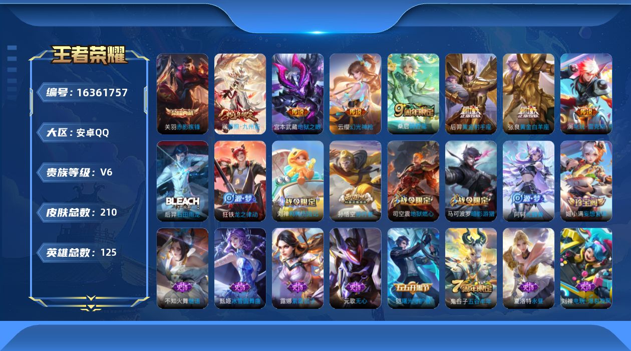 [16361757]账号来源干净 保证账号找回包赔 薄利多销 冲销量 平台保证金向商家安卓Q-V6-最强王者段位-125英雄-210皮肤-1典藏皮肤-7传说-58史诗【英雄全皮】:戈娅全皮【荣耀典藏】:关羽赤影疾锋【传说皮肤】:澜愿照九州拓,云缨幻光神枪,桑启鸣野蒿,澜电玩雷克斯,张良黄金白羊座,后羿黄金射手座,宫本武藏地狱之眼【限定皮肤】:蒙犽顽岩魄,蔡文姬夏日便利店,虞姬夏日便利店,姜子牙天穹之誓,杨戬破阵退雄兵,狄仁杰阴阳师,赵云皇家上将,扁鹊奇幻香踪,元歌无心,马可波罗暗影游猎,狄仁杰魔术师,达摩沙漠行僧,项羽海滩派对,兰陵王金庭之子,孙悟空孙行者,李元芳云中旅人,钟馗驱傩正仪,杨戬潮玩骑兵,干将莫邪胡桃夹子,鬼谷子五谷丰年,苏烈千军破阵,沈梦溪大漠名商,沈梦溪匿光破解者,裴擒虎擒涛扼浪,云中君纤云弄巧,嫦娥暖冬兔眠,西施玲珑珍味,蒙犽狂想玩偶喵,鲁班大师探海日志,桑启海盐诗旅,暃星界游侠,戈娅驭风魔法,艾琳流音漫舞,司空震地狱燃心,阿古朵江河有灵,张良古海寻踪,蒙犽百解令,高渐离燃音魔法,妲己灵卜魔法,鬼谷子天穹祈灯,姬小满妄想食味,鲁班七号蔬乡物语,刘邦剑破天穹,程咬金群星魔术团,镜青焰无极,项羽苍威无极,周瑜熔金海岸【赛季限定】:达摩沙漠行僧,兰陵王金庭之子,张良古海寻踪,李元芳云中旅人,钟馗驱傩正仪,苏烈千军破阵,沈梦溪大漠名商,裴擒虎擒涛扼浪,鲁班大师探海日志,桑启海盐诗旅,鬼谷子天穹祈灯,刘邦剑破天穹,姜子牙天穹之誓【战令限定】:蔡文姬夏日便利店,虞姬夏日便利店,扁鹊奇幻香踪,马可波罗暗影游猎,艾琳流音漫舞,杨戬潮玩骑兵,嫦娥暖冬兔眠,西施玲珑珍味,蒙犽狂想玩偶喵,司空震地狱燃心,暃星界游侠,戈娅驭风魔法,高渐离燃音魔法,妲己灵卜魔法,鲁班七号蔬乡物语,镜青焰无极,项羽苍威无极