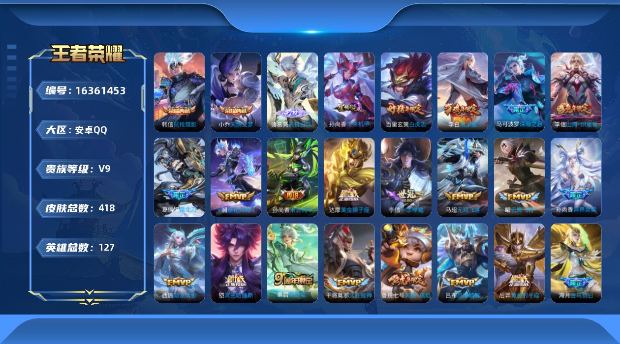 [16361453]【特价出售/店主推荐】金标孙悟空、打野30段,安卓Q-V9-最强王者段位-127英雄-418皮肤-2典藏皮肤-1无双-2星传说-34传说-135史诗 【英雄全皮】:狂铁全皮,李信全皮,空空儿全皮,影全皮,海诺全皮 【荣耀典藏】:小乔天鹅之梦,韩信弑枪猎影 【无双皮肤】:诸葛亮天机白泽 【传说皮肤】:后羿神树通天,桑启鸣野蒿,夏侯惇霜北刀,铠冥王哈迪斯,海月金乌负日,澜逐花归海,兰陵王影龙天霄,宫本武藏惊梅引,李信山海炽霜斩,吕布怒海麟威,马可波罗深海之息,马超无双飞将,鲁班七号寅虎瑞焰,孙尚香异界灵契,赵云淬星耀世,西施游龙清影,李元芳飞鸢探春,虞姬启明星使,孙悟空零号赤焰,曜云鹰飞将,李信一念神魔,刘备时之恋人,貂蝉猫影幻舞,张良黄金白羊座,干将莫邪久胜战神,虞姬云霓雀翎,达摩黄金狮子座,百里玄策白虎志,花木兰冠军飞将,梦奇胖达荣荣,后羿黄金射手座,李白凤求凰,孙尚香末日机甲,狄仁杰超时空战士 【限定皮肤】:白起狰,夏侯惇霜北刀,铠冥王哈迪斯,蒙犽顽岩魄,蔡文姬夏日便利店,虞姬夏日便利店,姜子牙天穹之誓,狄仁杰阴阳师,虞姬凯尔特女王,赵云皇家上将,墨子神迹守卫,嬴政白昼王子,孙尚香蔷薇恋人,孙尚香异界灵契,鲁班七号寅虎瑞焰,庄周蜃楼王,庄周高山流水,高渐离死亡摇滚,阿轲迷踪丽影,钟无艳王者之锤,钟无艳超时空战士,孙膑妖精王,扁鹊炼金王,白起夜都怪侠,芈月重明,芈月幻夜卜梦,吕布猎兽之王,元歌云间偶戏,元歌无心,夏侯惇朔风刀,甄姬游园惊梦,甄姬落雪兰心,曹操烛龙,典韦穷奇,典韦蓝屏警告,典韦岱宗,马可波罗暗影游猎,马可波罗深海之息,马可波罗山海玄木吟,狄仁杰魔术师,狄仁杰万华元夜,达摩沙漠行僧,项羽海滩派对,老夫子醍醐杖,老夫子航海奇遇记,关羽冰锋战神,程咬金演武夺筹,刘邦夺宝奇兵,韩信逐梦之影,韩信傲雪梅枪,兰陵王影龙天霄,兰陵王驯魔猎人,兰陵王金庭之子,花木兰青春决赛季,亚瑟狮心王,亚瑟潮玩骑士王,孙悟空至尊宝,孙悟空零号赤焰,孙悟空孙行者,牛魔御旌,后羿圣弓游侠,李元芳银河之约,李元芳云中旅人,虞姬启明星使,钟馗驱傩正仪,杨玉环遇见飞天,杨玉环寅虎心曲,女娲朔望之晖,干将莫邪冰霜恋舞曲,干将莫邪真爱魔法,雅典娜单词大作战,雅典娜黎明之约,蔡文姬繁星吟游,太乙真人饕餮,鬼谷子原初探秘者,鬼谷子五谷丰年,黄忠火炮绅士,苏烈千军破阵,百里玄策白虎志,百里玄策原初追