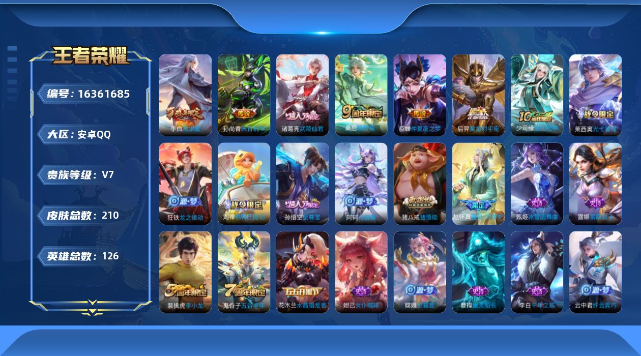 [16361685]保证金商家 安全第一 找回包赔安卓Q-V7-最强王者段位-126英雄-210皮肤-7传说-49史诗【英雄全皮】:孙权全皮【传说皮肤】:后羿神树通天,桑启鸣野蒿,后羿黄金射手座,诸葛亮武陵仙君,貂蝉仲夏夜之梦,李白凤求凰,孙尚香末日机甲【限定皮肤】:白起狰,狄仁杰阴阳师,虞姬凯尔特女王,赵云皇家上将,嬴政优雅恋人,庄周蜃楼王,庄周高山流水,高渐离死亡摇滚,孙膑妖精王,扁鹊炼金王,吕布猎兽之王,夏侯惇朔风刀,曹操烛龙,典韦穷奇,狄仁杰魔术师,狄仁杰万华元夜,达摩沙漠行僧,项羽海滩派对,老夫子醍醐杖,程咬金演武夺筹,兰陵王金庭之子,孙悟空至尊宝,牛魔御旌,李元芳云中旅人,钟馗驱傩正仪,杨玉环遇见飞天,雅典娜黎明之约,蔡文姬繁星吟游,太乙真人饕餮,太乙真人华丽摇滚,鬼谷子原初探秘者,鬼谷子五谷丰年,诸葛亮武陵仙君,苏烈千军破阵,百里玄策原初追逐者,弈星混沌棋,梦奇顽趣,沈梦溪大漠名商,明世隐疑决卦,裴擒虎李小龙,狂铁御狮,米莱狄御霄,云中君纤云弄巧,盾山御銮,猪八戒猪悟能,上官婉儿梁祝,嫦娥拒霜思,桑启海盐诗旅,张良古海寻踪,鬼谷子天穹祈灯,沈梦溪龙舞盛年,刘邦剑破天穹,周瑜熔金海岸【年限皮肤】:李白凤求凰