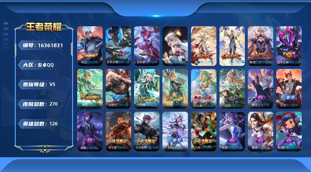 [16361831]【店主推荐捡漏号!可直接换绑】安卓Q-V5-最强王者段位-126英雄-270皮肤-1典藏皮肤-7传说-77史诗-3星元
