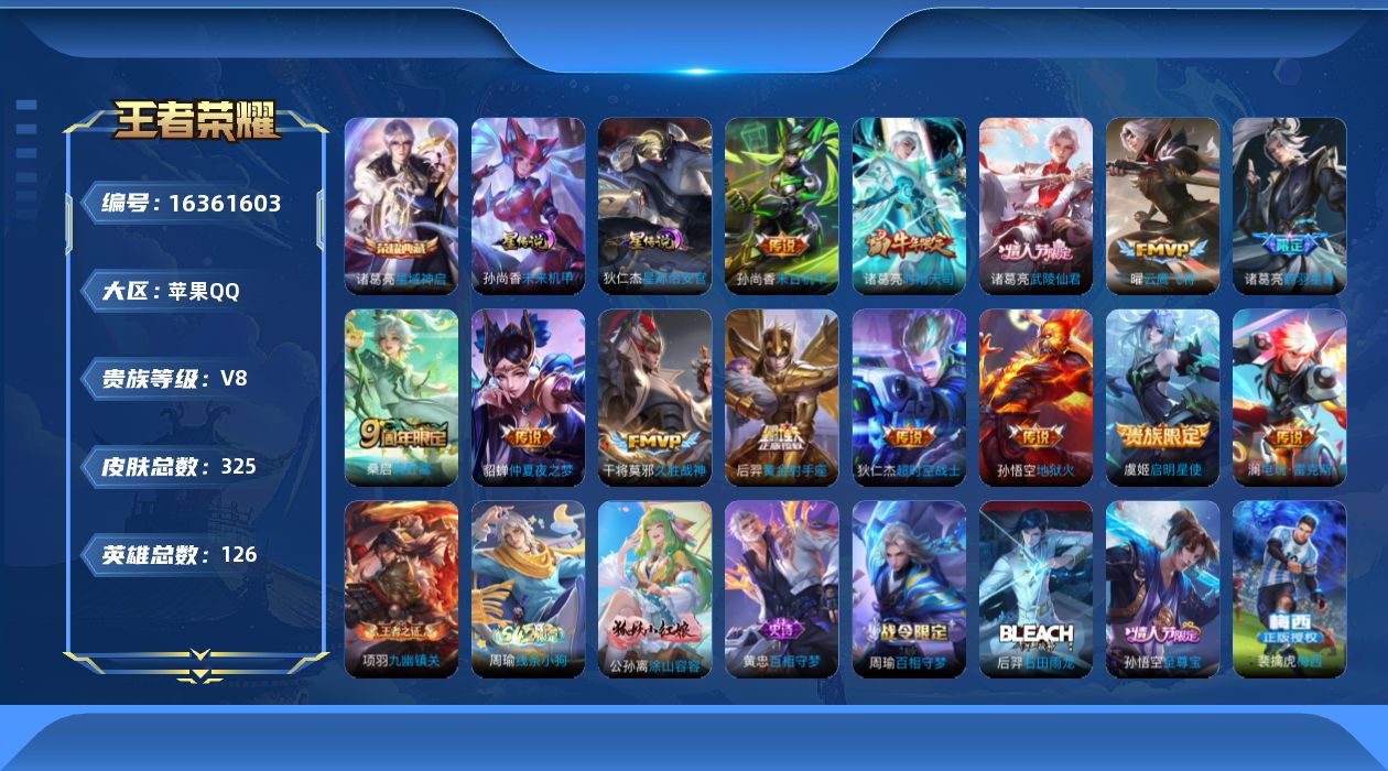 [16361603]【店主推荐捡漏号!可直接换绑】,苹果Q-V8-最强王者段位-126英雄-322皮肤-1典藏皮肤-13传说-90史诗 【英雄全皮】:猪八戒全皮 【荣耀典藏】:诸葛亮星域神启 【传说皮肤】:桑启鸣野蒿,诸葛亮鹤羽星尊,澜电玩雷克斯,诸葛亮时雨天司,虞姬启明星使,曜云鹰飞将,干将莫邪久胜战神,后羿黄金射手座,诸葛亮武陵仙君,貂蝉仲夏夜之梦,孙尚香末日机甲,孙悟空地狱火,狄仁杰超时空战士 【限定皮肤】:蔡文姬夏日便利店,虞姬夏日便利店,姜子牙天穹之誓,狄仁杰阴阳师,赵云皇家上将,墨子神迹守卫,妲己时之彼端,嬴政优雅恋人,嬴政白昼王子,鲁班七号狮舞东方,庄周高山流水,高渐离玩趣恶龙,阿轲迷踪丽影,钟无艳超时空战士,芈月重明,吕布猎兽之王,吕布御风骁将,周瑜赤莲之焰,元歌无心,夏侯惇朔风刀,甄姬落雪兰心,曹操烛龙,典韦穷奇,典韦蓝屏警告,马可波罗暗影游猎,狄仁杰魔术师,狄仁杰万华元夜,达摩沙漠行僧,项羽海滩派对,老夫子醍醐杖,老夫子航海奇遇记,安琪拉魔法小厨娘,程咬金演武夺筹,露娜一生所爱,刘邦夺宝奇兵,韩信飞衡,兰陵王驯魔猎人,兰陵王金庭之子,花木兰青春决赛季,孙悟空至尊宝,孙悟空大圣娶亲,牛魔御旌,后羿辉光之辰,后羿如梦令,后羿圣弓游侠,李元芳银河之约,李元芳云中旅人,虞姬霸王别姬,虞姬启明星使,钟馗神迹守卫,钟馗驱傩正仪,杨玉环遇见飞天,女娲朔望之晖,干将莫邪真爱魔法,蔡文姬繁星吟游,鬼谷子原初探秘者,鬼谷子五谷丰年,诸葛亮武陵仙君,诸葛亮时雨天司,诸葛亮鹤羽星尊,苏烈千军破阵,百里守约朱雀志,弈星混沌棋,公孙离蜜橘之夏,沈梦溪星空之诺,沈梦溪大漠名商,明世隐疑决卦,裴擒虎天狼狩猎者,裴擒虎李小龙,裴擒虎擒涛扼浪,狂铁御狮,狂铁电玩高手,米莱狄御霄,云中君纤云弄巧,盾山御銮,猪八戒西部大镖客,猪八戒猪悟能,上官婉儿梁祝,嫦娥如梦令,西施玲珑珍味,鲁班大师探海日志,桑启海盐诗旅,艾琳女武神,阿古朵江河有灵,张良古海寻踪,裴擒虎梅西,鬼谷子天穹祈灯,刘邦剑破天穹 【年限皮肤】:百里守约朱雀志,后羿辉光之辰,吕布御风骁将,诸葛亮时雨天司,韩信飞衡 【赛季限定】:芈月重明,夏侯惇朔风刀,曹操烛龙,典韦穷奇,狄仁杰万华元夜,达摩沙漠行僧,老夫子醍醐杖,程咬金演武夺筹,兰陵王金庭之子,张良古海寻踪,牛魔御旌,李元芳云中旅人,钟馗驱傩正仪,鬼谷子原初探秘者,苏烈千军破阵,弈星混沌棋,