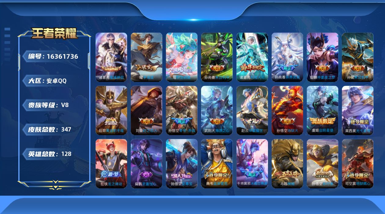 [16361736]账号来源干净 保证账号找回包赔 薄利多销 冲销量 平台保证金向商家 安卓Q-V8-最强王者段位-128英雄-347皮肤-1典藏皮肤-1典藏英雄-15传说-112史诗