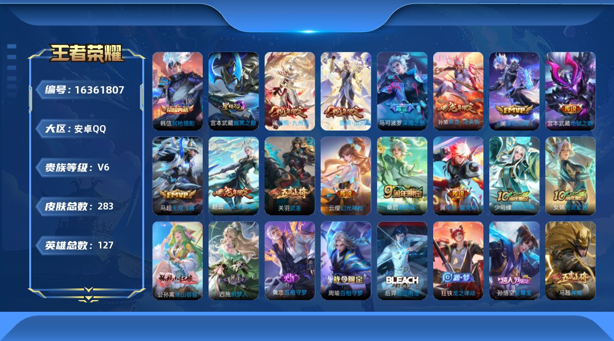 - [16328096]安卓WX-V7-最强王者段位-126英雄-222皮肤-1典藏皮肤-1无双-16传说-43史诗-5星传说! 【英雄全皮】:空空儿全皮,影全皮 【荣耀典藏】:韩信弑枪猎影 【无双皮肤】:曜器灵螭龙剑 【传说皮肤】:后羿神树通天,澜愿照九州拓,桑启鸣野蒿,赵云乘龙铭钟鼎,马超琥珀纪元,澜逐花归海,露娜霜月吟,孙悟空齐天大圣,李信山海炽霜斩,吕布怒海麟威,李白诗剑行,赵云淬星耀世,曜云鹰飞将,梦奇胖达荣荣,李白凤求凰,宫本武藏地狱之眼 【限定皮肤】:姜子牙天穹之誓,李白谪仙醉月,狄仁杰阴阳师,赵云皇家上将,孙尚香蔷薇恋人,夏侯惇朔风刀,狄仁杰魔术师,狄仁杰万华元夜,达摩沙漠行僧,项羽海滩派对,韩信傲雪梅枪,兰陵王金庭之子,孙悟空美猴王,孙悟空孙行者,孙悟空齐天大圣,李元芳云中旅人,钟馗驱傩正仪,雅典娜黎明之约,鬼谷子原初探秘者,鬼谷子五谷丰年,苏烈千军破阵,沈梦溪大漠名商,明世隐疑决卦,裴擒虎李小龙,裴擒虎擒涛扼浪,云中君纤云弄巧,李信山海炽霜斩,嫦娥拒霜思,鲁班大师探海日志,桑启海盐诗旅,艾琳流音漫舞,司空震地狱燃心,阿古朵江河有灵,张良古海寻踪,蒙恬荣光圣徽,鬼谷子天穹祈灯,马超琥珀纪元,姬小满妄想食味,赵云乘龙铭钟鼎,沈梦溪龙舞盛年,刘邦剑破天穹,程咬金群星魔术团,刘备异域游侠,周瑜熔金海岸 【年限皮肤】:孙悟空美猴王,李白凤求凰,李信山海炽霜斩,赵云乘龙铭钟鼎,澜愿照九州拓 【赛季限定】:夏侯惇朔风刀,明世隐疑决卦,鬼谷子原初探秘者,狄仁杰万华元夜,钟馗驱傩正仪,苏烈千军破阵,达摩沙漠行僧,兰陵王金庭之子,沈梦溪大漠名商,李元芳云中旅人,桑启海盐诗旅,裴擒虎擒涛扼浪,鲁班大师探海日志,张良古海寻踪,鬼谷子天穹祈灯,刘邦剑破天穹,姜子牙天穹之誓,东皇太一噬灭天穹,太乙真人谧流熔炉,钟馗虚灵犬护,甄姬逆浪荇歌,亚瑟荣光之誓,雅典娜黎明之约,蒙恬荣光圣徽 【战令限定】:司空震地狱燃心,艾琳流音漫舞,亚连破空之剑,孙悟空神迹守卫 【史诗皮肤】:赵云皇家上将,赵云未来纪元,貂蝉圣诞恋歌,甄姬冰雪圆舞曲,狄仁杰魔术师,廉颇地狱岩魂,宫本武藏鬼剑武藏,孙尚香蔷薇恋人,孙尚香水果甜心,嬴政暗夜贵公子,嬴政摇滚巨星,妲己魅力维加斯,妲己女仆咖啡,墨子金属风暴,吕布圣诞狂欢,李白千年之狐,张飞乱世虎臣,小乔缤纷独角兽,兰陵王暗隐猎兽者,雅典娜冰冠公主,安琪拉心灵骇客,程咬金功夫厨神,