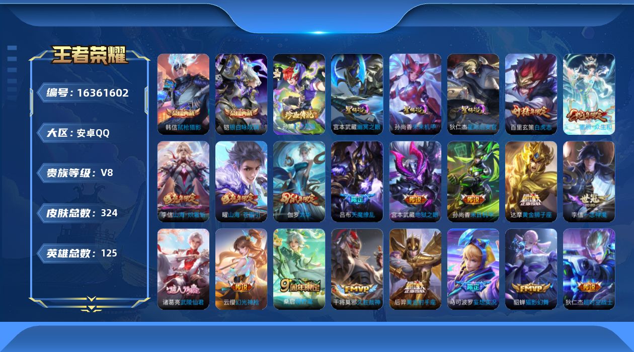 [16361602]【店主推荐捡漏号!可直接换绑】安卓Q-V8-最强王者段位-125英雄-324皮肤-2典藏皮肤-1珍品传说-22传说-79史诗