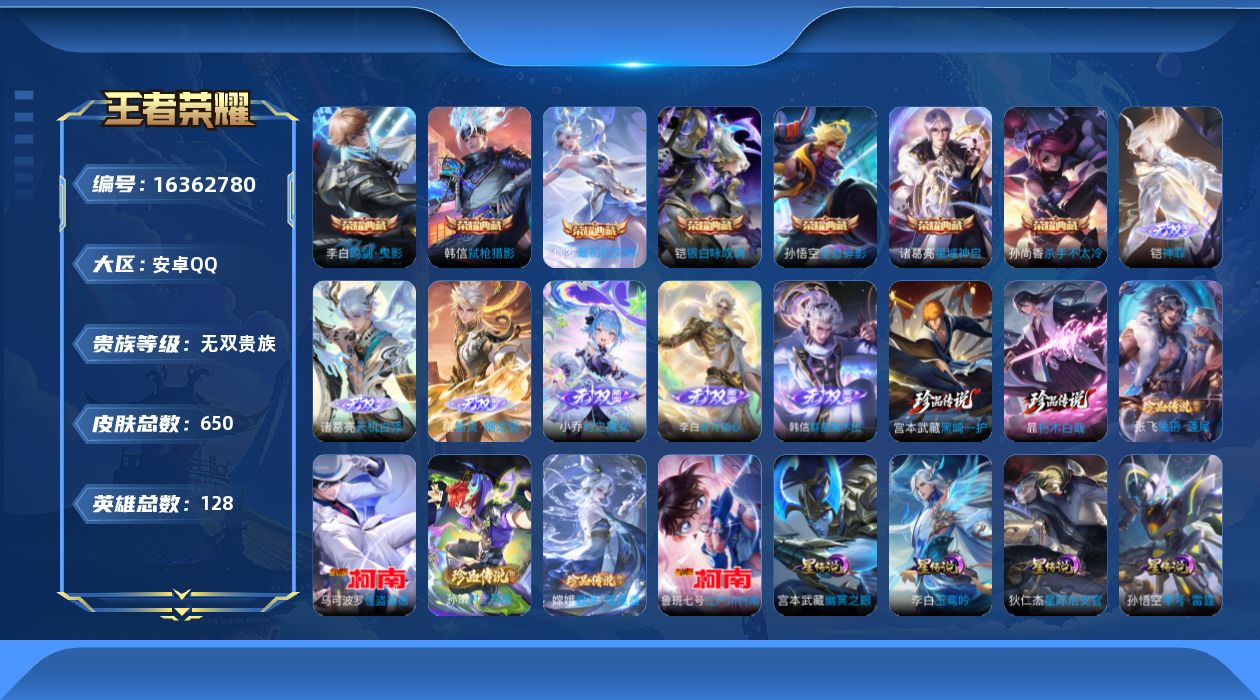 - [13866500]安卓Q-V7-至尊星耀III段位-124英雄-210皮肤-1典藏-0珍品无双-0无双-0珍品传说-16传说-70史诗 【荣耀典藏】:韩信弑枪猎影 【传说皮肤】:澜愿照九州拓,桑启鸣野蒿,铠冥王哈迪斯,诸葛亮鹤羽星尊,橘右京枫霜尽,娜可露露前尘镜,孙尚香音你闪耀,马超无双飞将,孙策末日机甲,赵云淬星耀世,曜云鹰飞将,李信一念神魔,干将莫邪久胜战神,后羿黄金射手座,孙悟空地狱火,狄仁杰超时空战士 【限定皮肤】:铠冥王哈迪斯,蔡文姬夏日便利店,虞姬夏日便利店,姜子牙天穹之誓,杨戬破阵退雄兵,狄仁杰阴阳师,赵云皇家上将,妲己热情桑巴,钟无艳超时空战士,元歌无心,甄姬落雪兰心,狄仁杰魔术师,项羽海滩派对,韩信飞衡,王昭君午后时光,娜可露露前尘镜,橘右京枫霜尽,孙悟空至尊宝,孙悟空大圣娶亲,李元芳云中旅人,鬼谷子五谷丰年,诸葛亮鹤羽星尊,百里守约朱雀志,沈梦溪大漠名商,裴擒虎李小龙,裴擒虎擒涛扼浪,狂铁电玩高手,嫦娥暖冬兔眠,鲁班大师探海日志,桑启海盐诗旅,暃星界游侠,艾琳女武神,阿古朵江河有灵,张良古海寻踪,蒙恬荣光圣徽,妲己灵卜魔法,鬼谷子天穹祈灯,姬小满妄想食味,沈梦溪龙舞盛年,鲁班七号蔬乡物语,李元芳蔬乡物语,刘邦剑破天穹,程咬金群星魔术团,镜青焰无极,项羽苍威无极,周瑜熔金海岸 【年限皮肤】:百里守约朱雀志,韩信飞衡 【赛季限定】:张良古海寻踪,李元芳云中旅人,沈梦溪大漠名商,裴擒虎擒涛扼浪,鲁班大师探海日志,桑启海盐诗旅,鬼谷子天穹祈灯,蒙恬荣光圣徽,刘邦剑破天穹,姜子牙天穹之誓 【战令限定】:蔡文姬夏日便利店,虞姬夏日便利店,钟无艳超时空战士,甄姬落雪兰心,王昭君午后时光,狂铁电玩高手,嫦娥暖冬兔眠,暃星界游侠,妲己灵卜魔法,鲁班七号蔬乡物语,李元芳蔬乡物语,镜青焰无极,项羽苍威无极 【史诗皮肤】:鲁班七号电玩小子,露娜紫霞仙子,赵云皇家上将,赵云未来纪元,貂蝉圣诞恋歌,甄姬冰雪圆舞曲,狄仁杰魔术师,宫本武藏鬼剑武藏,孙尚香水果甜心,嬴政摇滚巨星,妲己魅力维加斯,妲己女仆咖啡,墨子龙骑士,墨子金属风暴,吕布圣诞狂欢,曹操幽灵船长,李白千年之狐,吕布末日机甲,妲己热情桑巴,张飞乱世虎臣,孙悟空至尊宝,花木兰水晶猎龙者,夏侯惇乘风破浪,小乔缤纷独角兽,兰陵王暗隐猎兽者,诸葛亮黄金分割率,亚瑟心灵战警,安琪拉心灵骇客,百里守约特工魅影,铠曙光守护者,蔡文姬舞动绿茵,刘