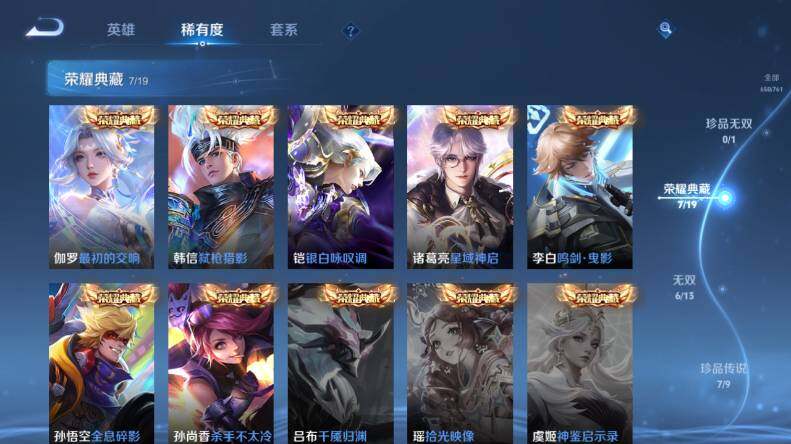 【荣耀典藏】:孙悟空全息碎影,孙尚香杀手不太冷,李白鸣剑曳影,诸葛亮星域神启,铠银白咏叹调,韩信弑枪猎影,伽罗最初的交响