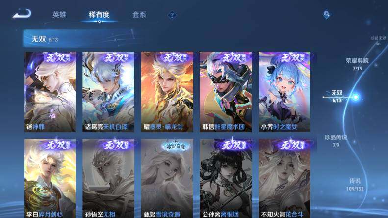 【无双皮肤】:李白碎月剑心,小乔时之魔女,韩信群星魔术团,曜器灵螭龙剑,诸葛亮天机白泽,铠神罪