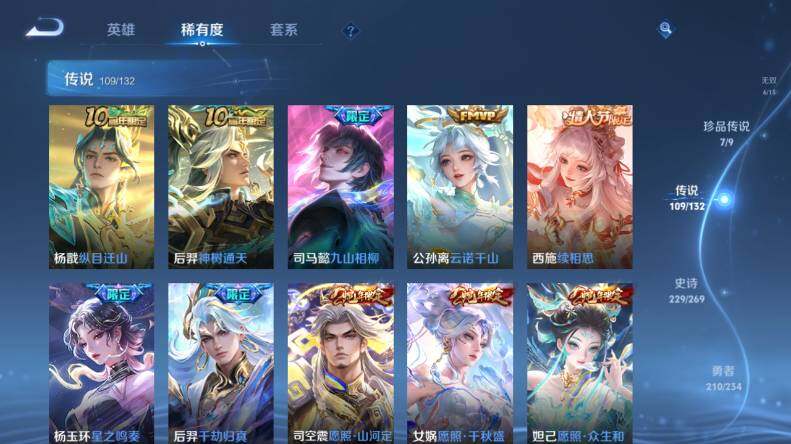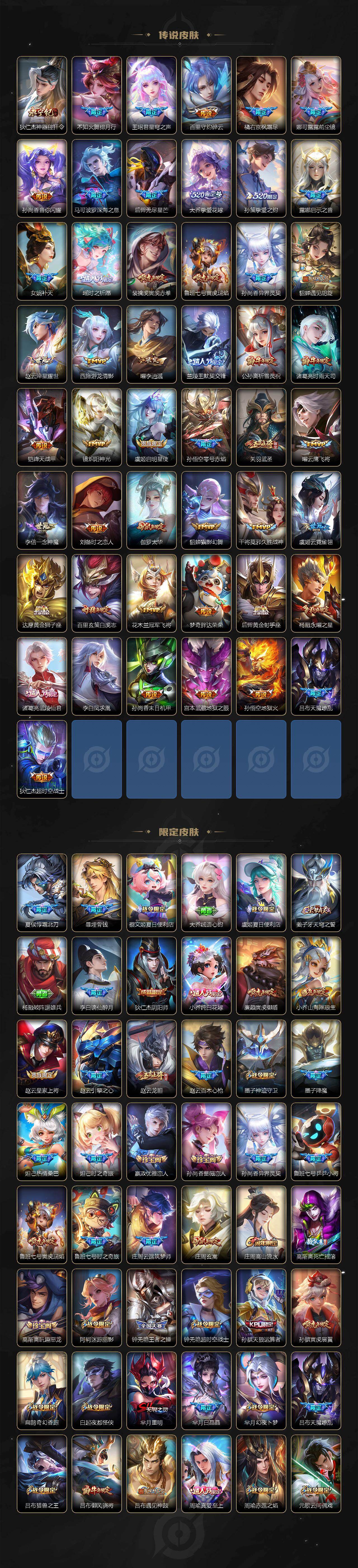 【传说皮肤】:杨戬纵目迁山,后羿神树通天,司马懿九山相柳,公孙离云诺千山,西施续相思,杨玉环星之鸣奏,后羿千劫归真,司空震愿照山河定,女娲愿照千秋盛,妲己愿照众生和,澜愿照九州拓,蔡文姬愿照福禄聚,虞姬愿照岁时盈,云缨幻光神枪,裴擒虎祥瑞亨通,嬴政玄雷天君,王昭君映山客,桑启鸣野蒿,夏侯惇霜北刀,朵莉亚心动手记,云中君群星魔术团,墨子黄金天蝎座,海月金乌负日,亚连落雪白狼,吕布曦玄引,貂蝉曦玄引,典韦战鼓燎原,孙尚香乘龙问璇玑,孙策乘龙淬吴钩,赵云乘龙铭钟鼎,马超琥珀纪元,铠琥珀纪元,澜逐花归海,艾琳觅芳踪,露娜霜月吟,狄仁杰夜礼服假面,王昭君永恒水手月亮,大乔时之奇旅,鲁班七号时之奇旅,兰陵王影龙天霄,吕布遇见神鼓,宫本武藏惊梅引,云缨鹤归松栖,上官婉儿妄想奇谈,马可波罗妄想实况,诸葛亮鹤羽星尊,澜电玩雷克斯,亚瑟追逃游戏,安琪拉追逃游戏,张飞百相守梦,夏洛特浮生妄,干将莫邪画中仙,花木兰燃星之曲