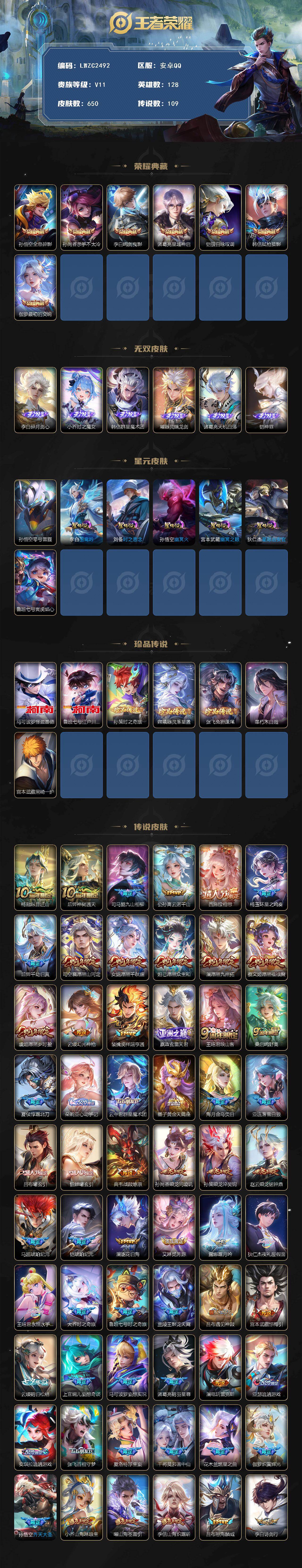 - [11688324]V8 1典藏 1珍品传说 22传说 125英雄 347皮肤 可修改实名 优质装备:九霄神辉(木兰典藏),怪盗基德,绛天战甲(鸡嘴战神),黄金白羊座,猫影幻舞,久胜战神,炽阳神光,一念神魔,地狱之眼,李逍遥,时之恋人-刘备(电焊工),淬星耀世,超时空战士-狄仁杰,无双飞将,音你闪耀(rap皮),山海·苍雷引(电光曜子),澜逐花归海 传说皮:祥瑞亨通,幻光神枪 珍宝阁皮:妄想食味,优雅恋人,蔷薇恋人 限定皮:愿照·九州拓(澜年限),鸣野蒿,至尊宝,傲雪梅枪,白晶晶,时雨天司(水龙头),神威(电光马子),飞衡(韩信年限),玄嵩(庄周年限),遇见飞天,高山流水,诗剑行,五谷丰年,冰锋战神,梁祝,岱宗(典韦年限),李小龙,逐梦之影,朱雀志(守约年限),默契交锋-花木兰,孙行者,玉兔公主 史诗皮:灵蛊蚀心,星界战将,谪仙醉月,茶境仙,百相守梦-百里守约,紫霞仙子,白龙吟,黄金分割率,特工魅影,千年之狐,永昼,江河有灵,魅语,百解令(蒙犽),高渐离燃音魔法,蒙恬荣光圣徽,青蛇,偶像歌手,电玩·爆裂旋风,暗夜猫娘,百相守梦(关羽),龙骑士(小龙虾),末日机甲-吕布,猫狗日记-孙策,猫狗日记-大乔,乱世虎臣,节奏热浪,修罗,女仆咖啡,摇滚巨星,水果甜心,绅士熊喵,天才门将,星夜王子,心灵骇客,功夫厨神,德古拉伯爵,暗隐猎兽者,幽灵船长,鬼剑武藏,心灵战警,乐园奇幻夜,舞动绿茵,地狱岩魂,诗语江南,繁星吟游(呼啦呼啦),拒霜思,缤纷独角兽,乘风破浪,逐浪之夏,水晶猎龙者,曙光守护者,箭羽风息,金属风暴,原初追逐者,圣诞狂欢,圣诞恋歌,鹰眼统帅,暗夜贵公子,魅力维加斯,黎明之约,无心,未来纪元-赵云