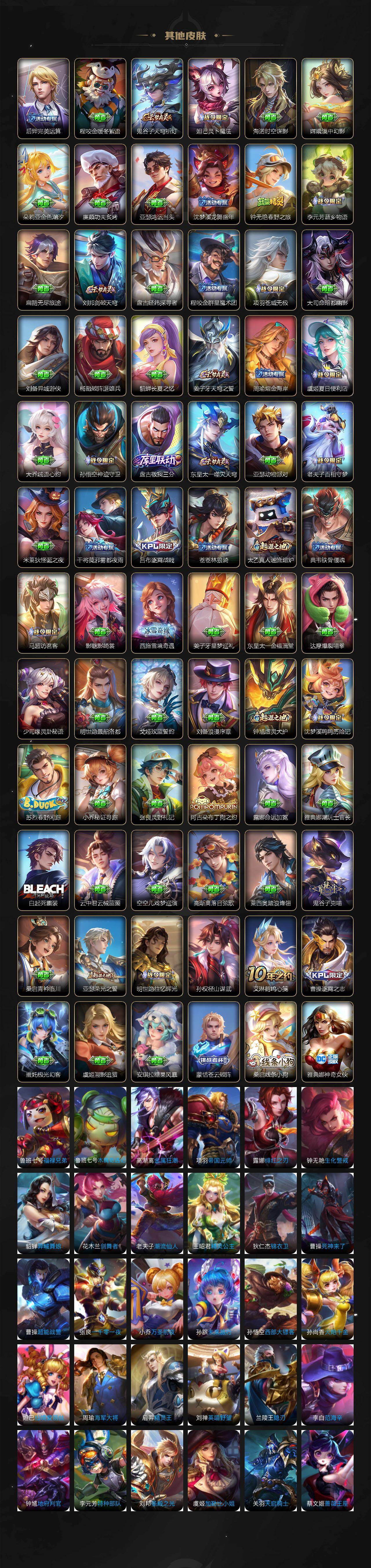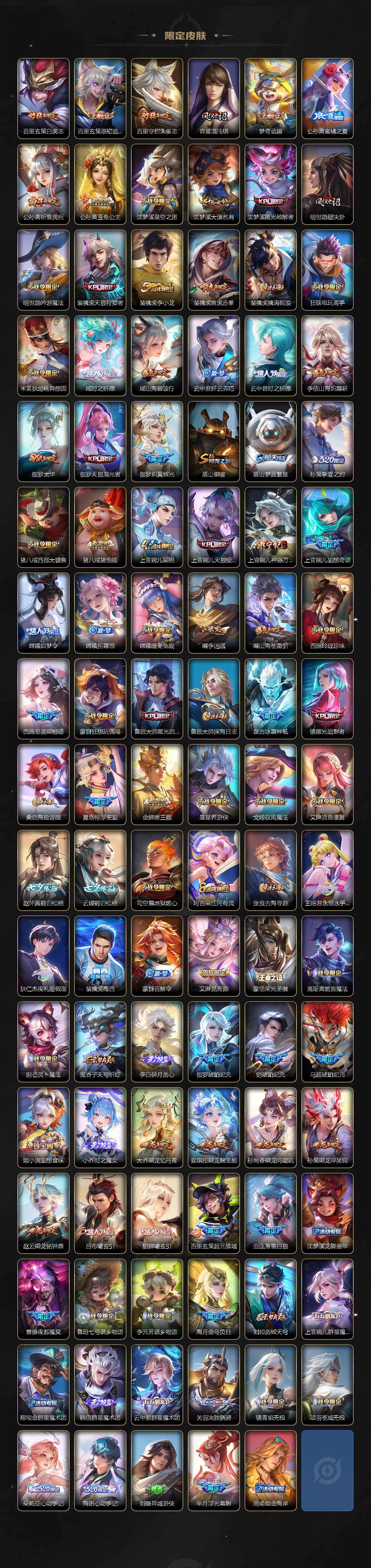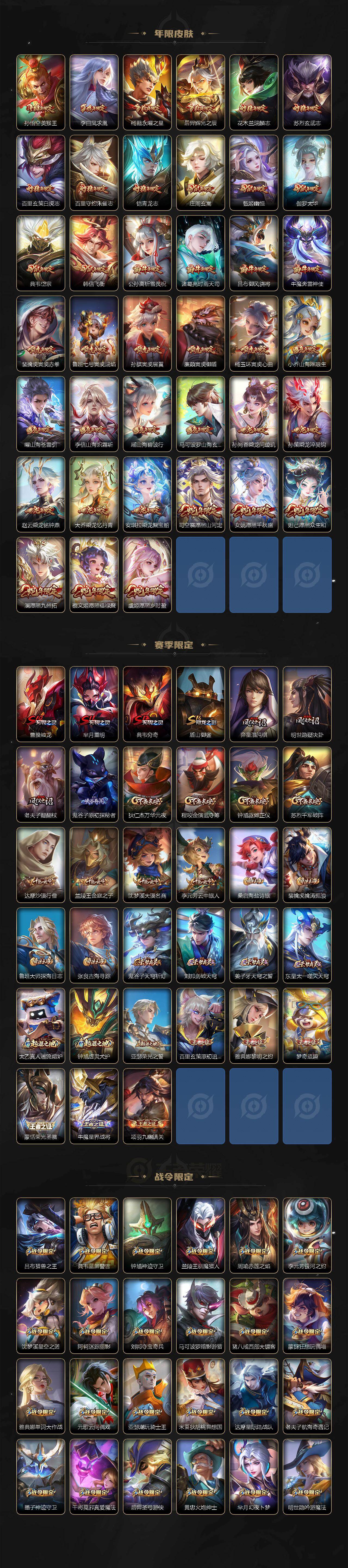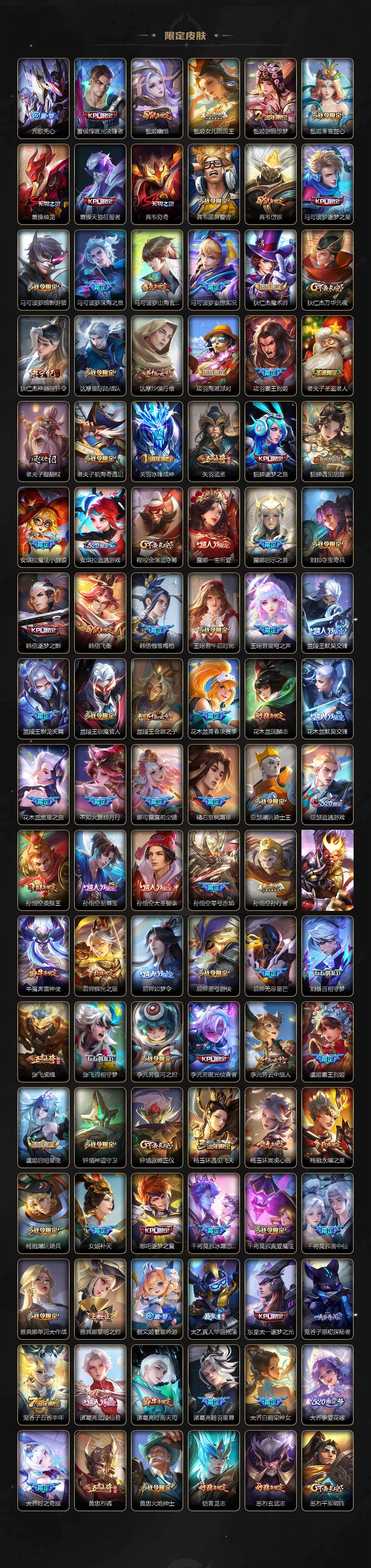 关羽冰锋战神,裴擒虎李小龙,上官婉儿梁祝,牛魔奔雷神使,貂蝉逐梦之音,公孙离祈雪灵祝,吕布御风骁将,诸葛亮时雨天司,赵云龙胆,关羽武圣,黄忠烈魂,张飞虎魄,马超神威,后羿辉光之辰,庄周玄嵩,典韦岱宗,甄姬幽恒,韩信飞衡,伽罗太华,曹操天狼征服者,裴擒虎天狼狩猎者,孙膑天狼运算者,上官婉儿天狼绘梦者,伽罗天狼溯光者,哪吒逐梦之翼,马可波罗逐梦之星,韩信逐梦之影,东皇太一逐梦之光,铠青龙志,百里玄策白虎志,花木兰瑞麟志,苏烈玄武志,百里守约朱雀志,项羽霸王别姬,虞姬霸王别姬,小乔纯白花嫁,周瑜真爱至上,孙悟空大圣娶亲,露娜一生所爱,花木兰默契交锋,兰陵王默契交锋,后羿如梦令,嫦娥如梦令,孙悟空至尊宝,裴擒虎梅西,雅典娜神奇女侠,妲己热情桑巴,干将莫邪冰霜恋舞曲,花木兰青春决赛季,公孙离蜜橘之夏,芈月白晶晶,安琪拉魔法小厨娘,赵云引擎之心,孙悟空美猴王,庄周云端筑梦师,鲁班七号乒乒小将,大乔白鹤梁神女,猪八戒猪悟能,廉颇寅虎·御盾,孙尚香异界灵契,老夫子圣诞老人,孙悟空孙行者,甄姬女儿国国王,镜匿光追影者,韩信傲雪梅枪,鲁班七号寅虎·瑞焰,孙膑寅虎·展翼,杨玉环寅虎·心曲,裴擒虎寅虎·赤拳,云中君时之祈愿,瑶时之祈愿,女娲补天,赵云百木心枪,公孙离玉兔公主,露娜启示之音,夏侯惇匿光决锋者,后羿无尽星芒,马可波罗深海之息,金蝉唐三藏,娜可露露前尘镜,橘右京枫霜尽,鲁班大师匿光启智者,妲己时之奇旅,王昭君星穹之声,不知火舞绯月行,上官婉儿神器·万象笔,盾山梦圆繁星,墨子降魔,李白诗剑行,马可波罗山海·玄木吟,盘古冰霜神祇,瑶山海·碧波行,兰陵王影龙天霄,西施至美·乘鲤谣,夏侯惇霜北刀,桑启鸣野蒿,艾琳陌上桑,王昭君映山客,澜愿照·九州拓,蔡文姬愿照·福禄聚,虞姬愿照·岁时盈,司空震愿照·山河定,妲己愿照·众生和,女娲愿照·千秋盛