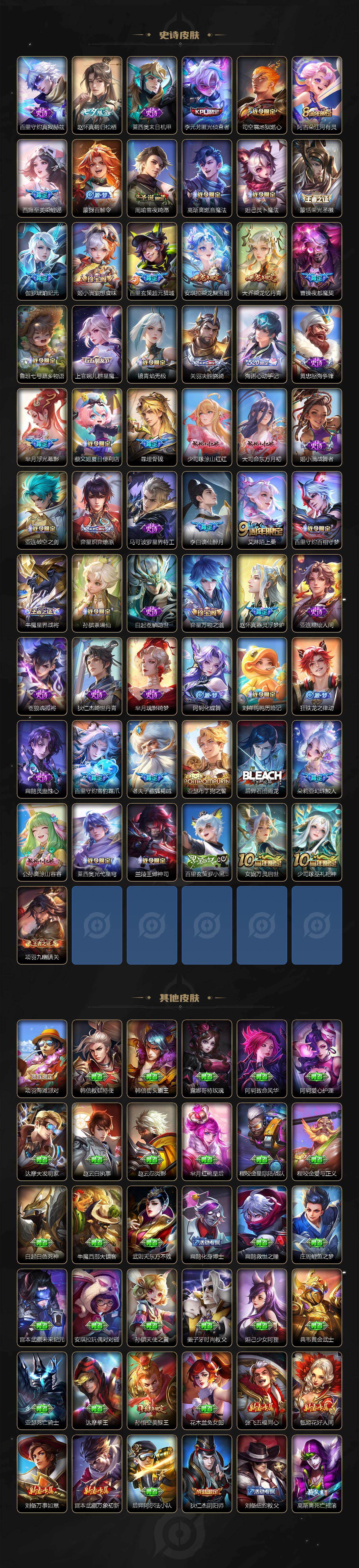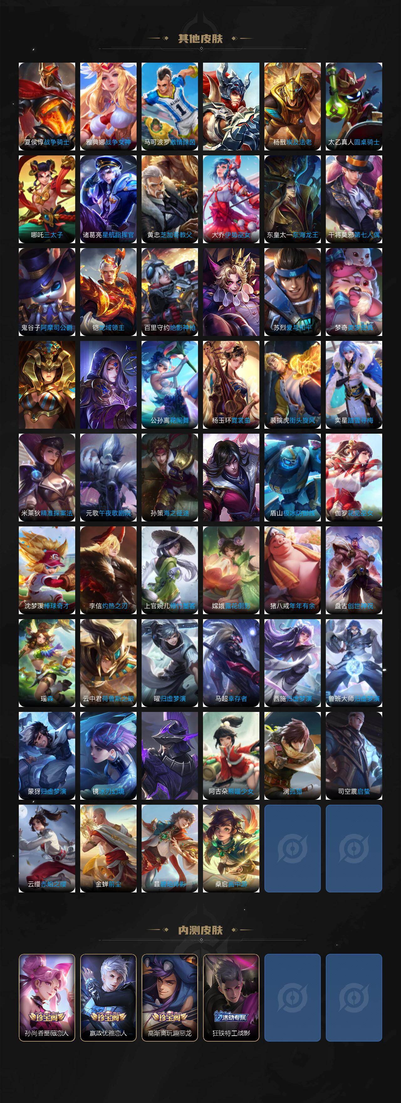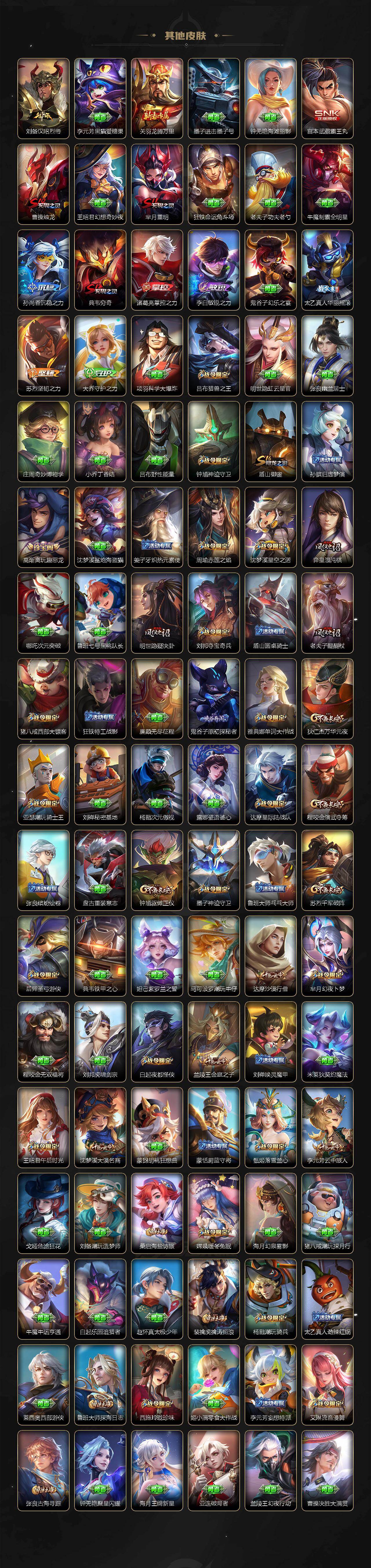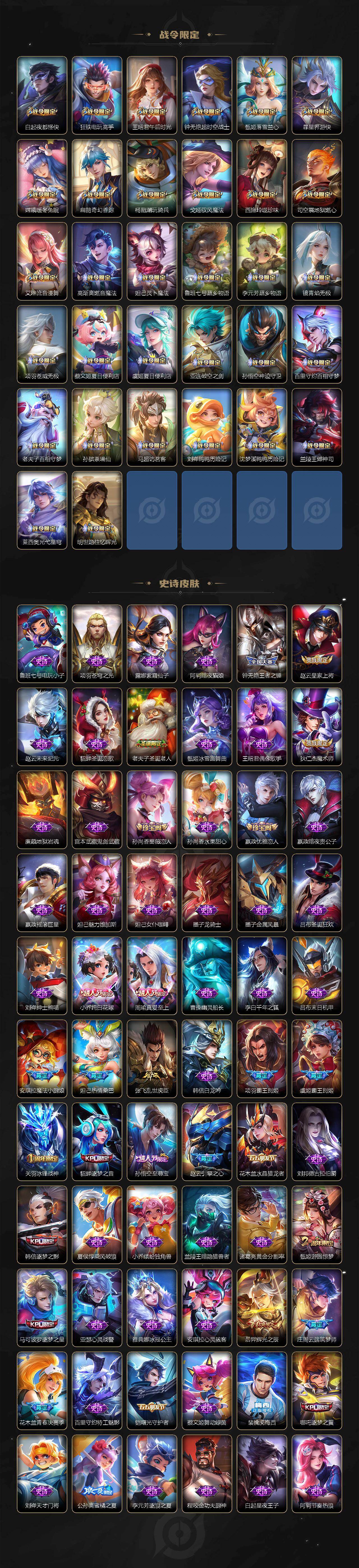 关羽冰锋战神,裴擒虎李小龙,上官婉儿梁祝,牛魔奔雷神使,貂蝉逐梦之音,公孙离祈雪灵祝,吕布御风骁将,诸葛亮时雨天司,赵云龙胆,关羽武圣,黄忠烈魂,张飞虎魄,马超神威,后羿辉光之辰,庄周玄嵩,典韦岱宗,甄姬幽恒,韩信飞衡,伽罗太华,曹操天狼征服者,裴擒虎天狼狩猎者,孙膑天狼运算者,上官婉儿天狼绘梦者,伽罗天狼溯光者,哪吒逐梦之翼,马可波罗逐梦之星,韩信逐梦之影,东皇太一逐梦之光,铠青龙志,百里玄策白虎志,花木兰瑞麟志,苏烈玄武志,百里守约朱雀志,项羽霸王别姬,虞姬霸王别姬,小乔纯白花嫁,周瑜真爱至上,孙悟空大圣娶亲,露娜一生所爱,花木兰默契交锋,兰陵王默契交锋,后羿如梦令,嫦娥如梦令,孙悟空至尊宝,裴擒虎梅西,雅典娜神奇女侠,妲己热情桑巴,干将莫邪冰霜恋舞曲,花木兰青春决赛季,公孙离蜜橘之夏,芈月白晶晶,安琪拉魔法小厨娘,赵云引擎之心,孙悟空美猴王,庄周云端筑梦师,鲁班七号乒乒小将,大乔白鹤梁神女,猪八戒猪悟能,廉颇寅虎·御盾,孙尚香异界灵契,老夫子圣诞老人,孙悟空孙行者,甄姬女儿国国王,镜匿光追影者,韩信傲雪梅枪,鲁班七号寅虎·瑞焰,孙膑寅虎·展翼,杨玉环寅虎·心曲,裴擒虎寅虎·赤拳,云中君时之祈愿,瑶时之祈愿,女娲补天,赵云百木心枪,公孙离玉兔公主,露娜启示之音,夏侯惇匿光决锋者,后羿无尽星芒,马可波罗深海之息,金蝉唐三藏,娜可露露前尘镜,橘右京枫霜尽,鲁班大师匿光启智者,妲己时之奇旅,王昭君星穹之声,不知火舞绯月行,上官婉儿神器·万象笔,盾山梦圆繁星,墨子降魔,李白诗剑行,马可波罗山海·玄木吟,盘古冰霜神祇,瑶山海·碧波行,兰陵王影龙天霄,西施至美·乘鲤谣,夏侯惇霜北刀,桑启鸣野蒿,艾琳陌上桑,王昭君映山客,澜愿照·九州拓,蔡文姬愿照·福禄聚,虞姬愿照·岁时盈,司空震愿照·山河定,妲己愿照·众生和,女娲愿照·千秋盛