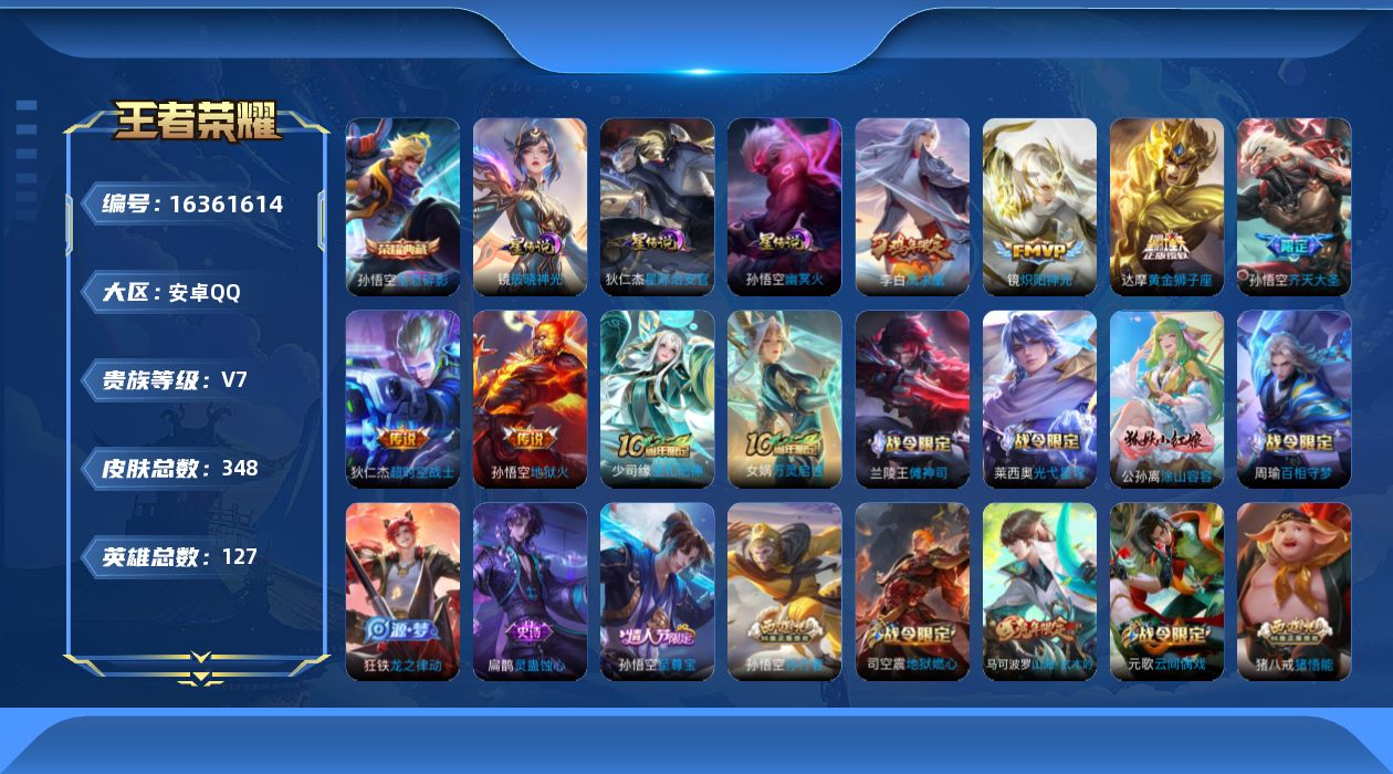 [16361614]【店主推荐捡漏号!可直接换绑】安卓Q-V7-最强王者段位-127英雄-348皮肤-1典藏皮肤-7传说-85史诗 【英雄全皮】:狂铁全皮,戈娅全皮,空空儿全皮,影全皮 【荣耀典藏】:孙悟空全息碎影 【传说皮肤】:后羿神树通天,孙悟空齐天大圣,镜炽阳神光,达摩黄金狮子座,李白凤求凰,孙悟空地狱火,狄仁杰超时空战士 【限定皮肤】:蔡文姬夏日便利店,大乔绒语心约,虞姬夏日便利店,狄仁杰阴阳师,赵云皇家上将,嬴政白昼王子,鲁班七号狮舞东方,庄周高山流水,高渐离死亡摇滚,高渐离玩趣恶龙,钟无艳超时空战士,扁鹊奇幻香踪,芈月重明,吕布猎兽之王,元歌云间偶戏,元歌无心,夏侯惇朔风刀,甄姬落雪兰心,曹操烛龙,典韦穷奇,马可波罗山海玄木吟,狄仁杰魔术师,狄仁杰万华元夜,达摩沙漠行僧,项羽海滩派对,老夫子醍醐杖,程咬金演武夺筹,韩信飞衡,王昭君午后时光,兰陵王金庭之子,亚瑟潮玩骑士王,孙悟空美猴王,孙悟空至尊宝,孙悟空孙行者,孙悟空齐天大圣,牛魔御旌,李元芳云中旅人,钟馗神迹守卫,钟馗驱傩正仪,杨玉环遇见飞天,杨戬潮玩骑兵,干将莫邪胡桃夹子,雅典娜黎明之约,鬼谷子原初探秘者,鬼谷子五谷丰年,苏烈千军破阵,百里玄策原初追逐者,弈星混沌棋,梦奇顽趣,沈梦溪大漠名商,明世隐疑决卦,裴擒虎李小龙,裴擒虎擒涛扼浪,狂铁御狮,狂铁电玩高手,米莱狄御霄,米莱狄胡桃异想国,云中君纤云弄巧,盾山御銮,猪八戒猪悟能,上官婉儿梁祝,嫦娥拒霜思,嫦娥暖冬兔眠,西施玲珑珍味,鲁班大师探海日志,桑启海盐诗旅,暃星界游侠,戈娅驭风魔法,艾琳女武神,艾琳流音漫舞,司空震地狱燃心,阿古朵江河有灵,张良古海寻踪,蒙犽百解令,蒙恬荣光圣徽,高渐离燃音魔法,妲己灵卜魔法,鬼谷子天穹祈灯,沈梦溪龙舞盛年,李元芳蔬乡物语,刘邦剑破天穹,程咬金群星魔术团,镜青焰无极,项羽苍威无极,周瑜熔金海岸 【年限皮肤】:孙悟空美猴王,李白凤求凰,韩信飞衡,马可波罗山海玄木吟 【赛季限定】:芈月重明,夏侯惇朔风刀,曹操烛龙,典韦穷奇,狄仁杰万华元夜,达摩沙漠行僧,老夫子醍醐杖,程咬金演武夺筹,兰陵王金庭之子,张良古海寻踪,牛魔御旌,李元芳云中旅人,钟馗驱傩正仪,雅典娜黎明之约,鬼谷子原初探秘者,苏烈千军破阵,百里玄策原初追逐者,弈星混沌棋,梦奇顽趣,沈梦溪大漠名商,明世隐疑决卦,裴擒虎擒涛扼浪,狂铁御狮,米莱狄御霄,盾山御銮,鲁班大师探海日志,